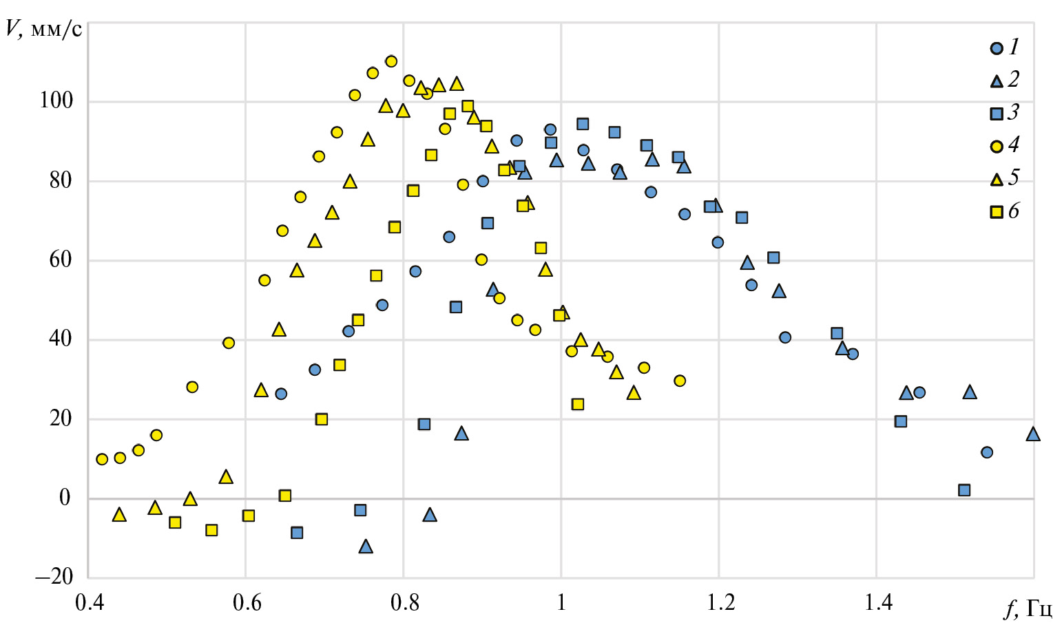 На рис. 12 представлены данные для скорости движения пластины против волн (режим работы ВП max), верхняя кромка которой установлена на нулевом уровне, а нижняя заглублена на 70 мм (такое заглубление соответствует примерно половине максимальной высоте волн и взаимодействие с подошвой волны здесь слабое). Измерения проведены для разных углов наклона: 20°, 30°, 45°, 60° (1–4). Видно, что положение максимумов скорости в зависимости от частоты для всех углов наклона примерно одинаково и почти совпадает с положением максимумов высоты волн (при крутизне 0.07 — штормовые волны). Величина максимумов скорости зависит от угла наклона пластины и наибольшие скорости судна против волн реализуются при углах наклона пластины в диапазоне 30°–45°.
