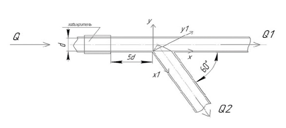 Разветвляющиеся каналы часто встречаются в различных технических устройствах: системах транспортировки горючего и охлаждающей жидкости, элементах химических технологий и т.д. Часто область разветвления представляет собой гладкий прямой канал с ответвлением, установленным к нему под некоторым углом. При этом в каналах ниже разветвления, как правило, формируются отрывные течения, интенсивность которых зависит как от угла между ответвлением и подводящим каналом, так и от доли расхода, протекающего через каждое ответвление. Отрыв потока приводит к повышению гидродинамического сопротивления таких каналов и другим неблагоприятным последствиям.