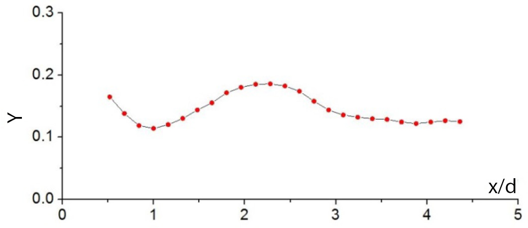 По результатам SIV-измерений проанализирована эволюция структуры течения на участке гладкого канала (подводящем участке артерии) между завихрителем и областью разветвления (анастомозом). Здесь при представлении результатов, в отличие от рис. 1, начало координат располагалось в выходном сечении завихрителя. Установлено, что степень закрутки потока вблизи завихрителя составляет Y = 0.16, а зависимость Y (x / d) имеет немонотонный характер, который можно объяснить отсутствием осевой симметрии поля течения вблизи завихрителя из-за влияния следа за его лопатками, характерным для лопаточных завихрителей [30]. При x / d > 2.5 степень закрутки плавно снижается с замедлением темпа снижения при приближении к области разветвления, и достигает величины Y ≈ 0.125 непосредственно перед разветвлением (рис. 3), что находится в пределах естественных физиологических значений.