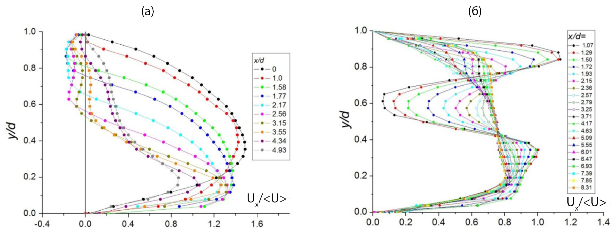 Рис. 13. Профили продольной компоненты скорости в ответвлении Q2: а — с закруткой; б — без закрутки потока.