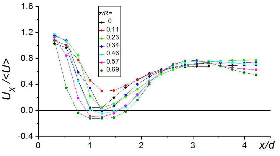 Результаты SIV измерений подтвердили выводы, сделанные на основе визуальных наблюдений. В результате анализа профилей скорости в ответвлении Q1 (рис. 7а) установлено, что область возвратного течения (область отрыва потока) вблизи верхней образующей ответвления под действием закрутки полностью исчезает (рис. 7а). Появление зоны торможения, обнаруженное в результате визуализации течения, подтверждается наличием области значительного дефекта скорости на профилях ее продольной компоненты (рис. 7б). О пространственной форме этой области можно судить по зависимостям Ux (x / d) при различных значениях z / R (рис. 8). Эти зависимости построены в параллельной xz плоскости, смещенной от нее на расстояние 0.11 d, т.е. проходящей через точку минимума профиля скорости при x / d = 1.07 (см. рис. 7б). Видно, что, несмотря на отсутствие возвратного течения в плоскости симметрии разветвления (плоскости xy), в верхней части ответвления Q1 (при z / R > 0.34) вблизи боковой стенки формируется рециркуляционная область, протяженность которой по координате x / d составляет до 1.0 d при приближении к стенке канала.