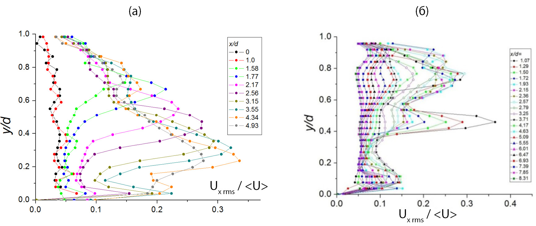 Рис. 14. Профили среднеквадратичных пульсаций продольной компоненты скорости потока в ответвлении Q2: а — с закруткой; б — без закрутки потока.