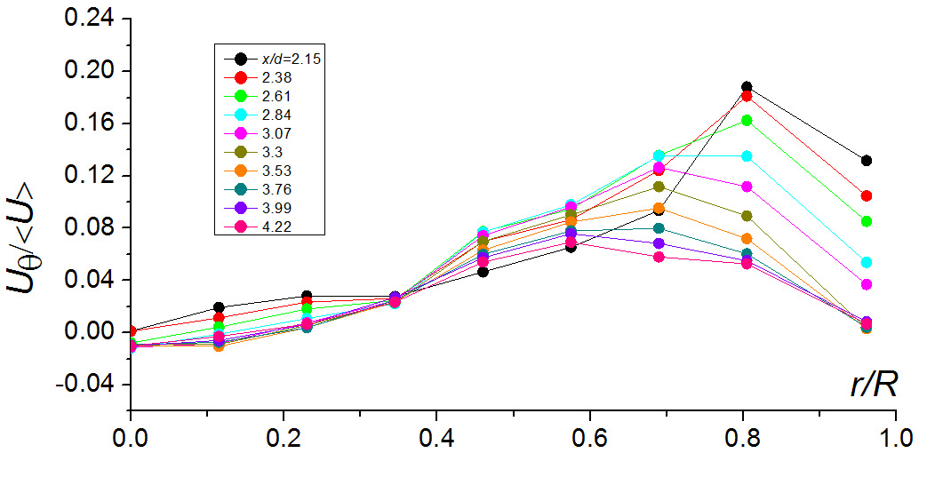 Рис. 5. Профили окружной компоненты скорости потока в канале вниз по течению от завихрителя.