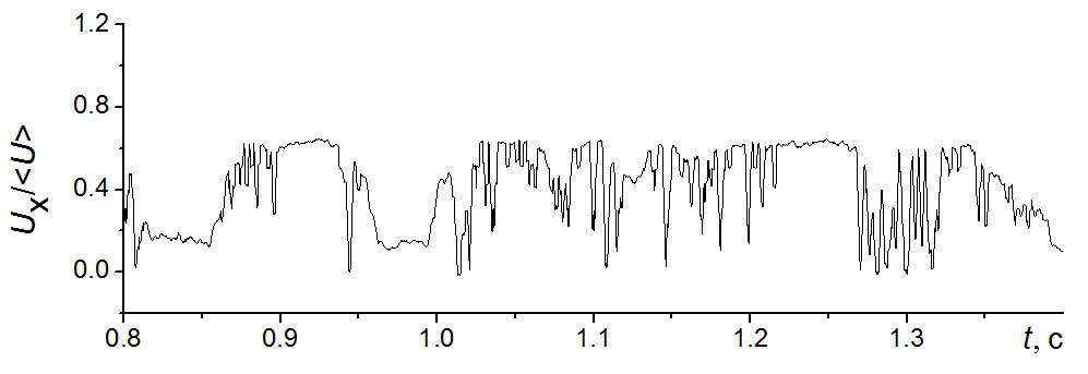 Рис. 17. Перемежающийся характер течения в ответвлении Q1 непосредственно за зоной торможения при x / d = 2.8.