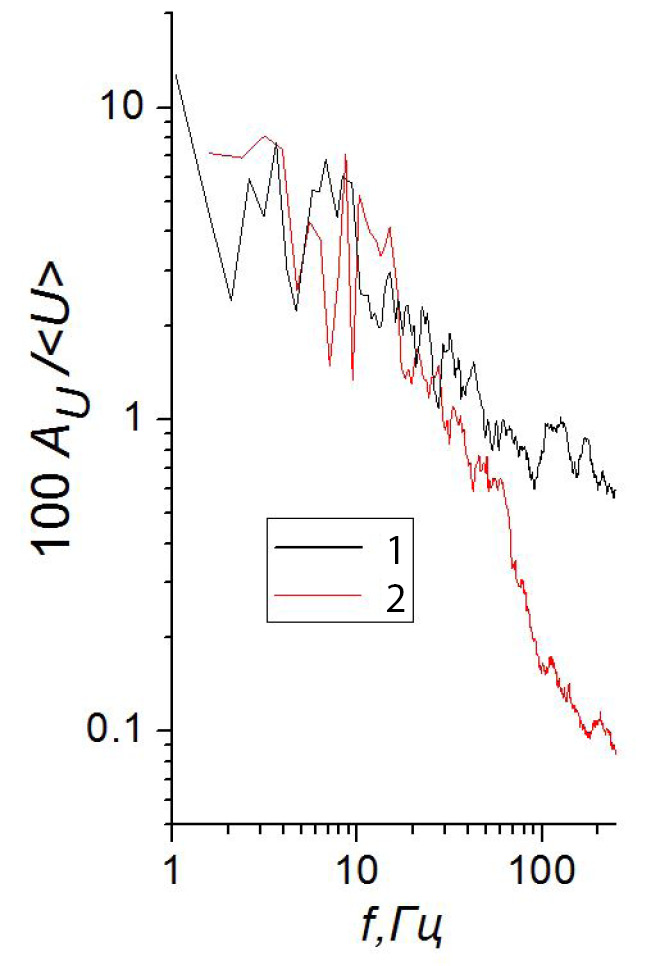 Рис. 24. Спектры пульсаций скорости потока в ответвлении Q2 в присутствии закрутки потока: 1 – x / d = 1.03; y / d = 0.65 (в слое смешения в области наибольших пульсаций скорости); 2 – x / d = 3.1; y / d = 0.69 (в слое смешения вниз по потоку).