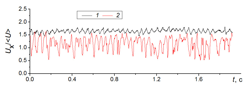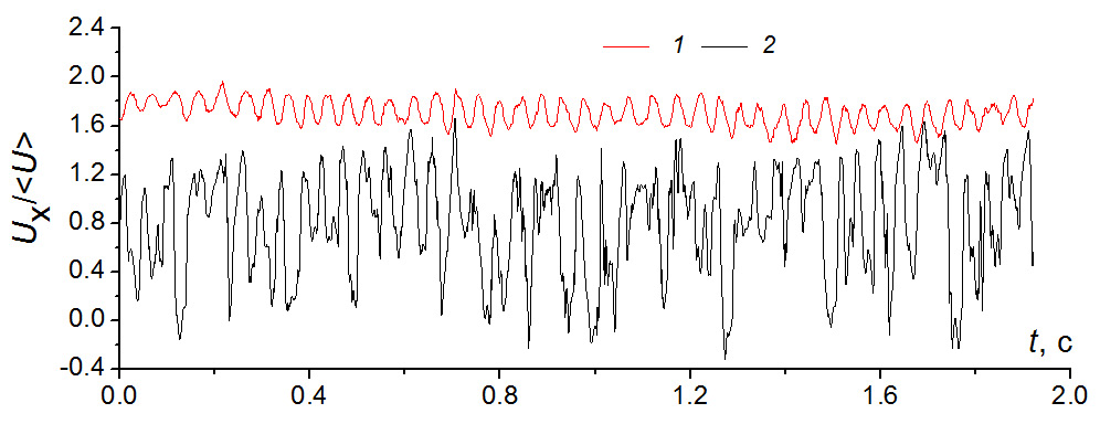 Рис. 21. Осциллограммы скорости потока в ответвлении Q2 при отсутствии закрутки: 1 – x / d = 1.0; y / d = 0.9 (в зоне высокоскоростной струи над областью отрыва потока); 2 – x / d = 2.5; y / d = 0.85 (в слое смешения на границе отрывной области).
