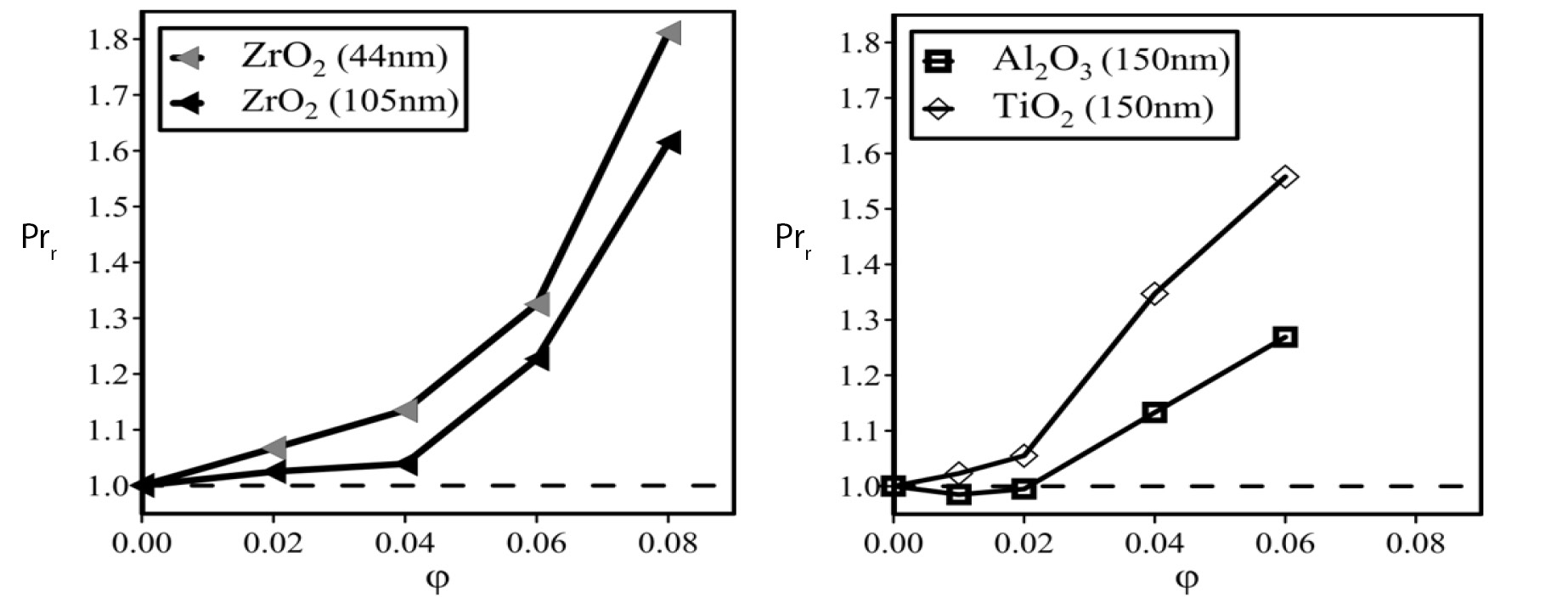 где μ0 — коэффициент вязкости базовой жидкости, а ai — некоторые константы. Несколько примеров такой зависимости, полученной разными авторами для наножидкостей на основе воды и этиленгликоля приведены в табл. 1 (здесь bf обозначает тип базовой жидкости, W — вода, EG — этиленгликоль, а np — материал наночастиц). Большинство приведенных здесь корреляций получены при концентрациях наночастиц не превышающих 5–8%. В отличие от универсальных классических соотношений Эйнштейна, Бэтчелора и т.п., корреляции, приведенные в табл. 1, чрезвычайно разнородны. Это связано с тем, что коэффициент вязкости наножидкости зависит не только от концентрации дисперсных частиц, но также от их размера. Впервые это удалось показать методом молекулярной динамики, см. обзор [37]. Позднее это было подтверждено многочисленными экспериментальными данными, пример такой зависимости приведен на рис. 1. Здесь представлена зависимость относительного коэффициента вязкости наножидкостей на основе воды от размера наночастиц SiO2, Al2O3, TiO2 и ZrO2 при фиксированной их объемной концентрации равной 2%. Характерной чертой этой зависимости является снижение вязкости наножидкости с увеличением размера наночастиц.