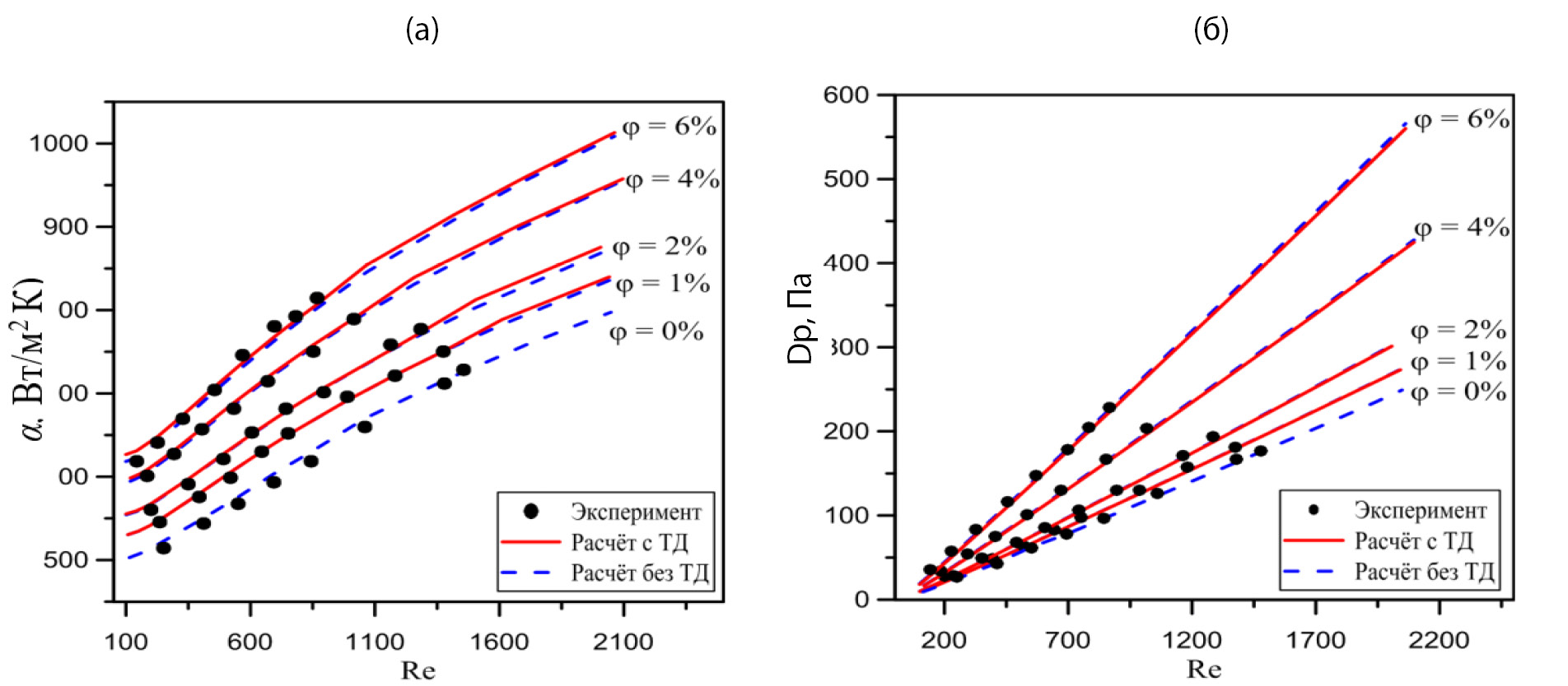 Рис. 4. Зависимость коэффициента теплоотдачи (а) и перепада давлений (б) от числа Рейнольдса.
