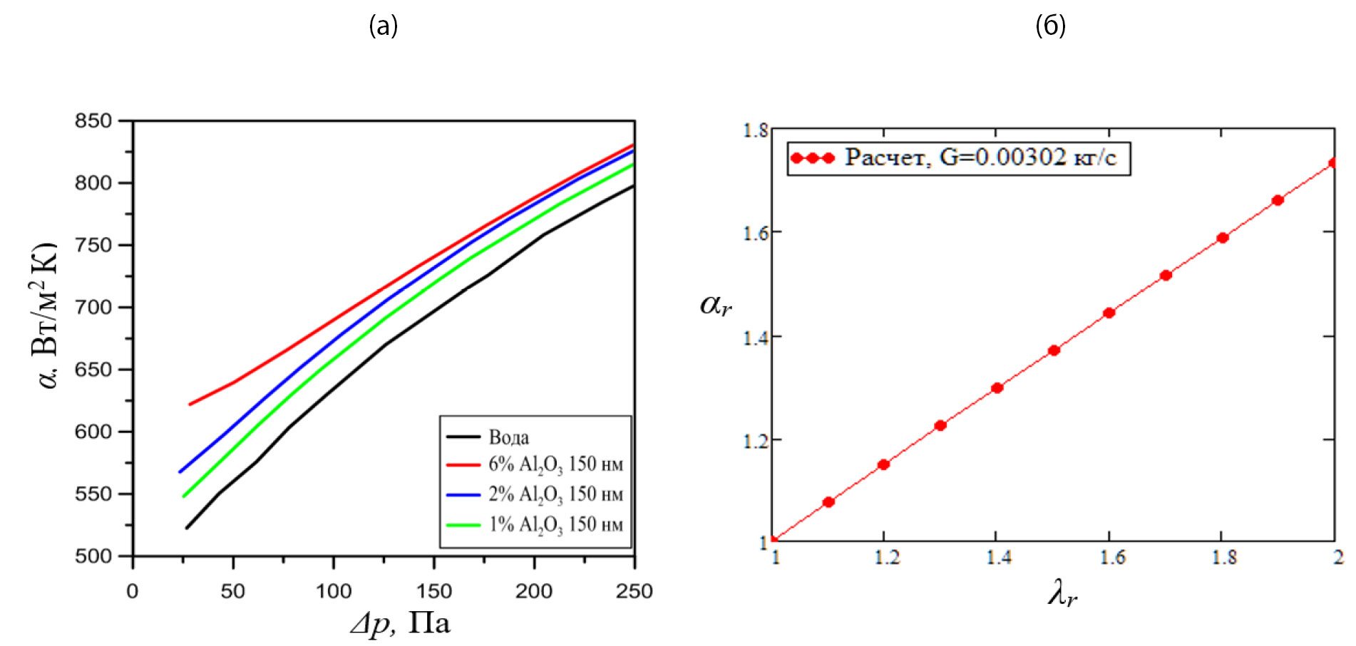 Рис. 5. Зависимости (а) среднего коэффициента теплоотдачи наножидкостей от перепада давления при различных концентрациях наночастиц и (б) относительного коэффициента теплоотдачи от относительного коэффициента теплопроводности, при постоянном расходе.