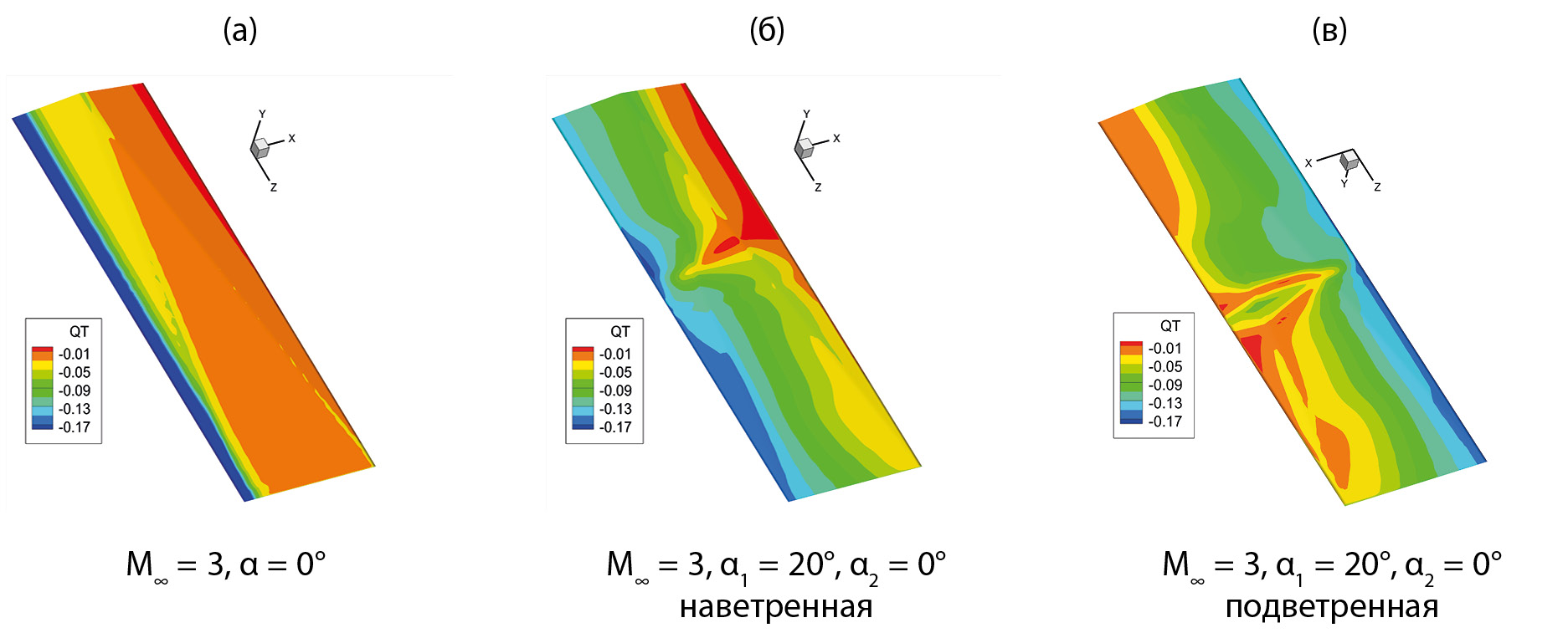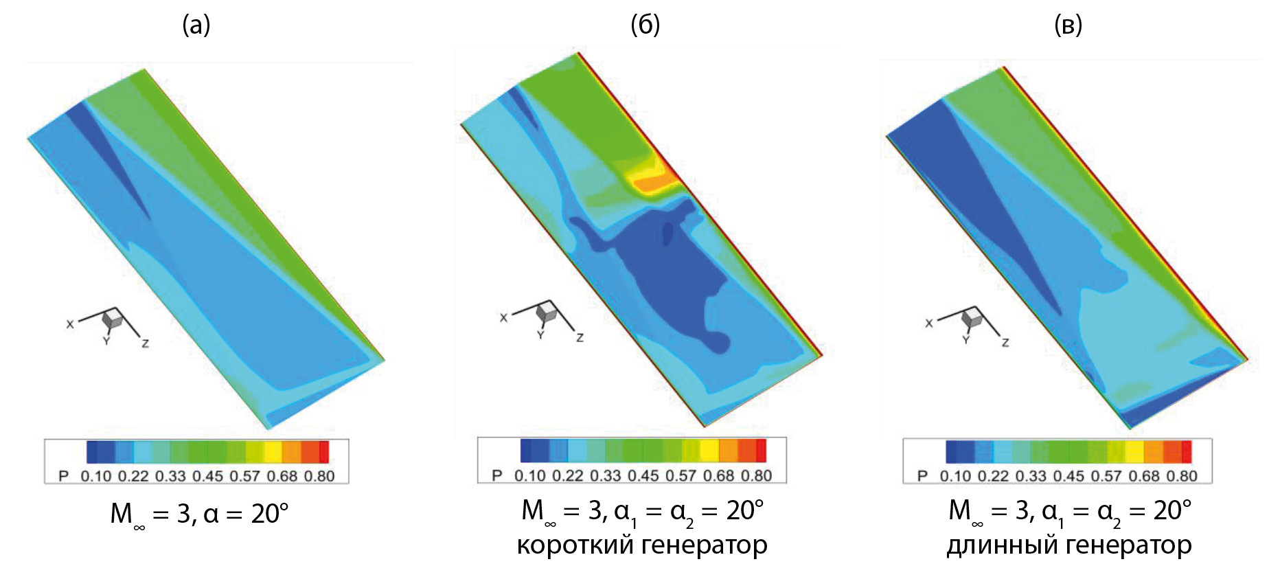 Число Маха набегающего потока задавалось М∞ = 3, число Рейнольдса — ReL = 1 × 107. Углы установки генератора принимались 10° и 20°, при этом угол атаки основного крыла устанавливался 0° и 20°. При обтекании крыла-генератора формируется вихревая пелена за его задней кромкой и концевой вихрь, сходящий с его боковой (концевой) кромки. Относительное расположение генератора и основного крыла выбрано таким образом, чтобы указанные вихревые структуры пересекали основное крыло.