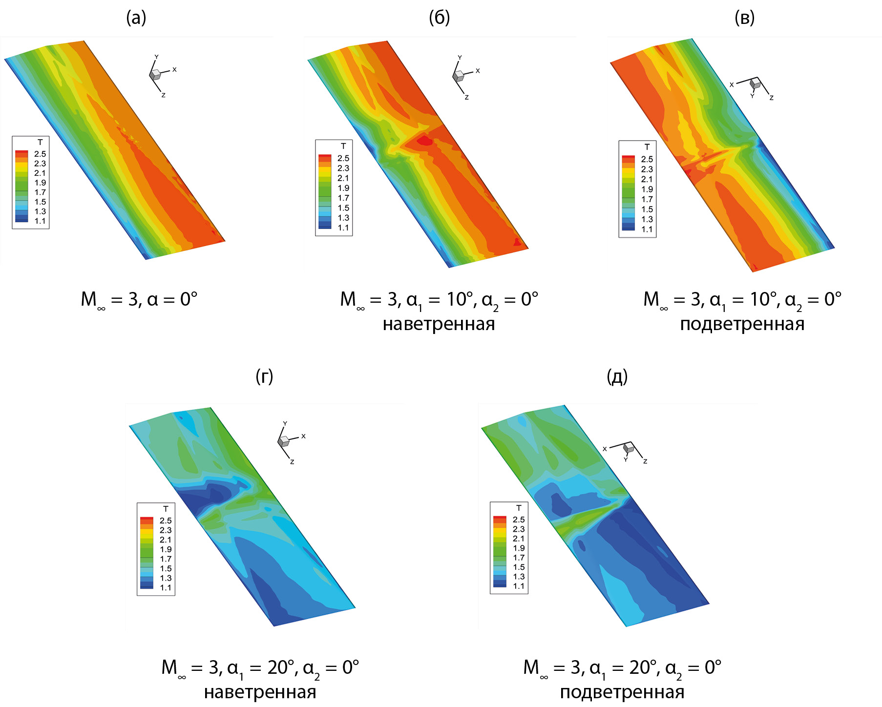 Рис. 6. Распределение температуры на поверхности основного крыла. Адиабатическая поверхность: обтекание невозмущенным потоком (а); обтекание при наличии короткого крыла генератора с углом атаки 10 по верхней (б) и нижней (в) поверхности; обтекание при наличии короткого крыла генератора с углом атаки 20° по верхней (г) и нижней (д) поверхности.