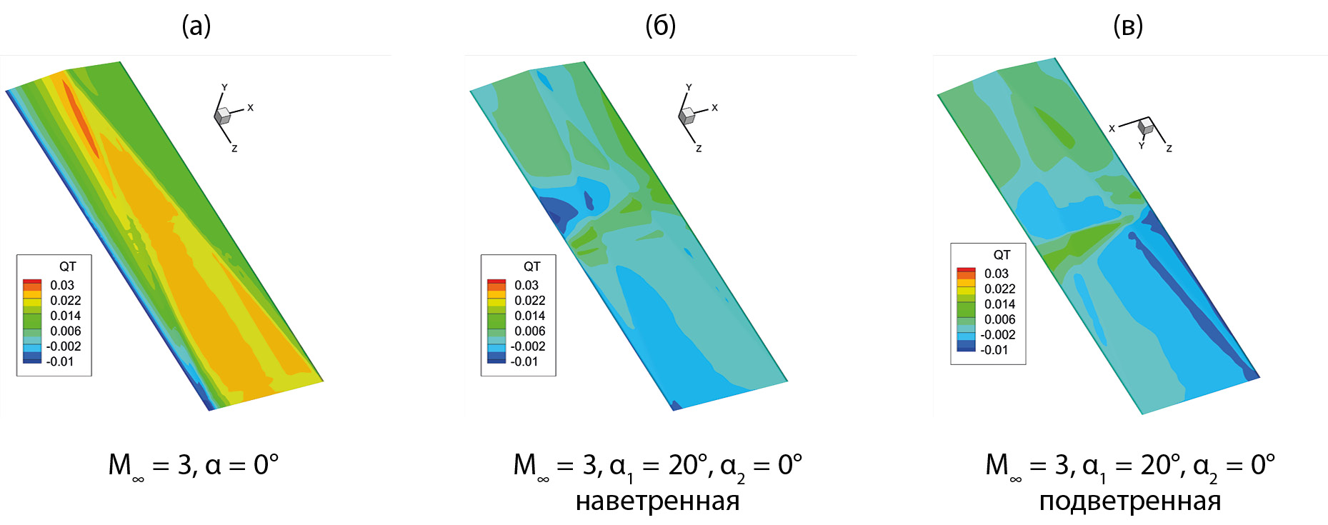 Рис. 7. Распределение тепловых потоков на поверхности основного крыла. Изотермическая поверхность, вариант Tw = 1.4: обтекание невозмущенным потоком (а), обтекание при наличии крыла генератора — верхняя (б) и нижняя (в) поверхности.