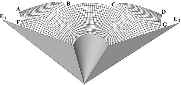 Положение точек E1 и E2 определяется стреловидностью передних кромок крыла. Для пластины с прямой кромкой (нулевая стреловидность) положение точек E1 и E2 устремляется в бесконечность и при этом координатные линии, локально перпендикулярные границам AF и DG, должны быть параллельны пластине, а условие коничности становится условием плоского течения в соответствующих границах. Границы AF и DG должны быть размещены вне области влияния течения около центрального тела.
