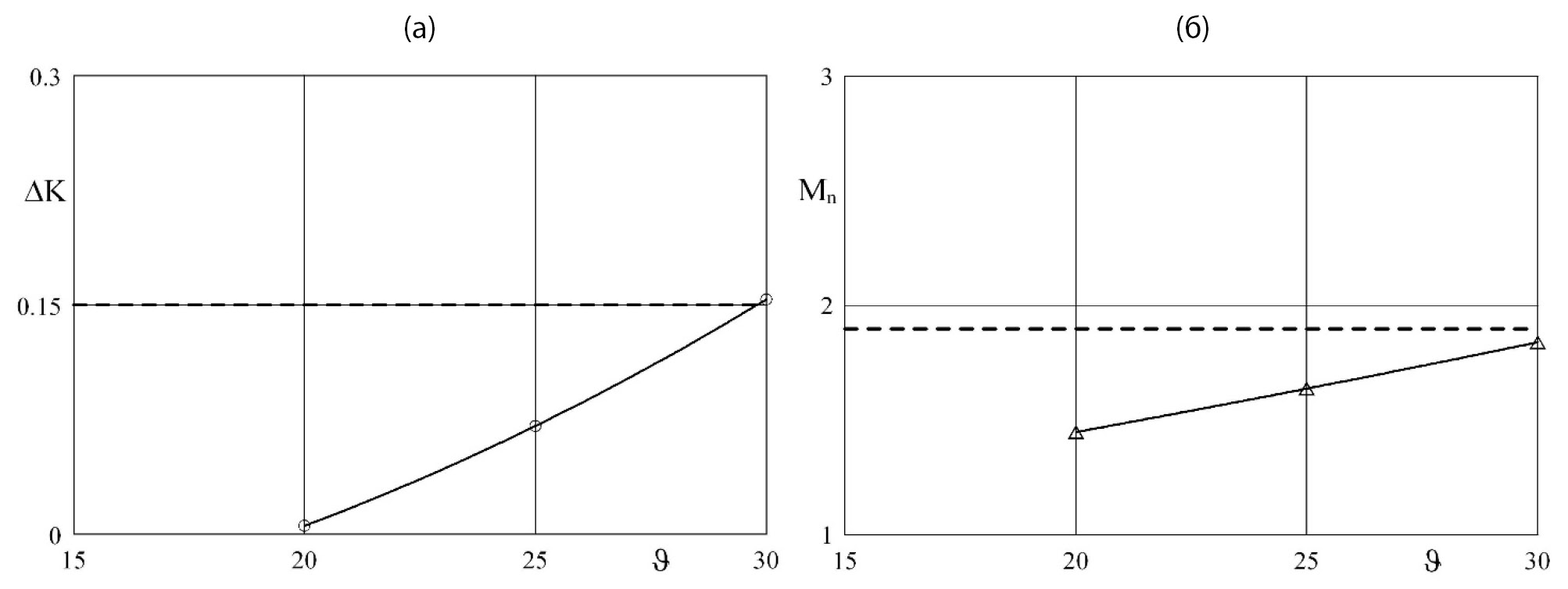 На рис. 9 приведены данные об интенсивности контактного разрыва ∆K, исходящего из точки ветвления на головной ударной волне и числа Маха Mn компоненты скорости, нормальной лучу, проходящему через эту точку, рассчитанные по методике [2] на основании результатов численных расчетов в рамках невязкой модели обтекания полуконусов на пластине под углом атаки. Полученные расчетные величины для α = 10° и ϑ ≥ 20, 25° значительно превышают пороговые значения критериев (пунктирные линии на рис. 9а, б), при которых возможно существование вихревых структур невязкого происхождения — вихревых особенностей Ферри. Поскольку экспериментальное и расчетное для модели идеального газа положения точки ветвления отличается очень незначительно (рис. 8б), то можно утверждать, что в реальном течение реализуются условия для существования вихревой особенности Ферри.