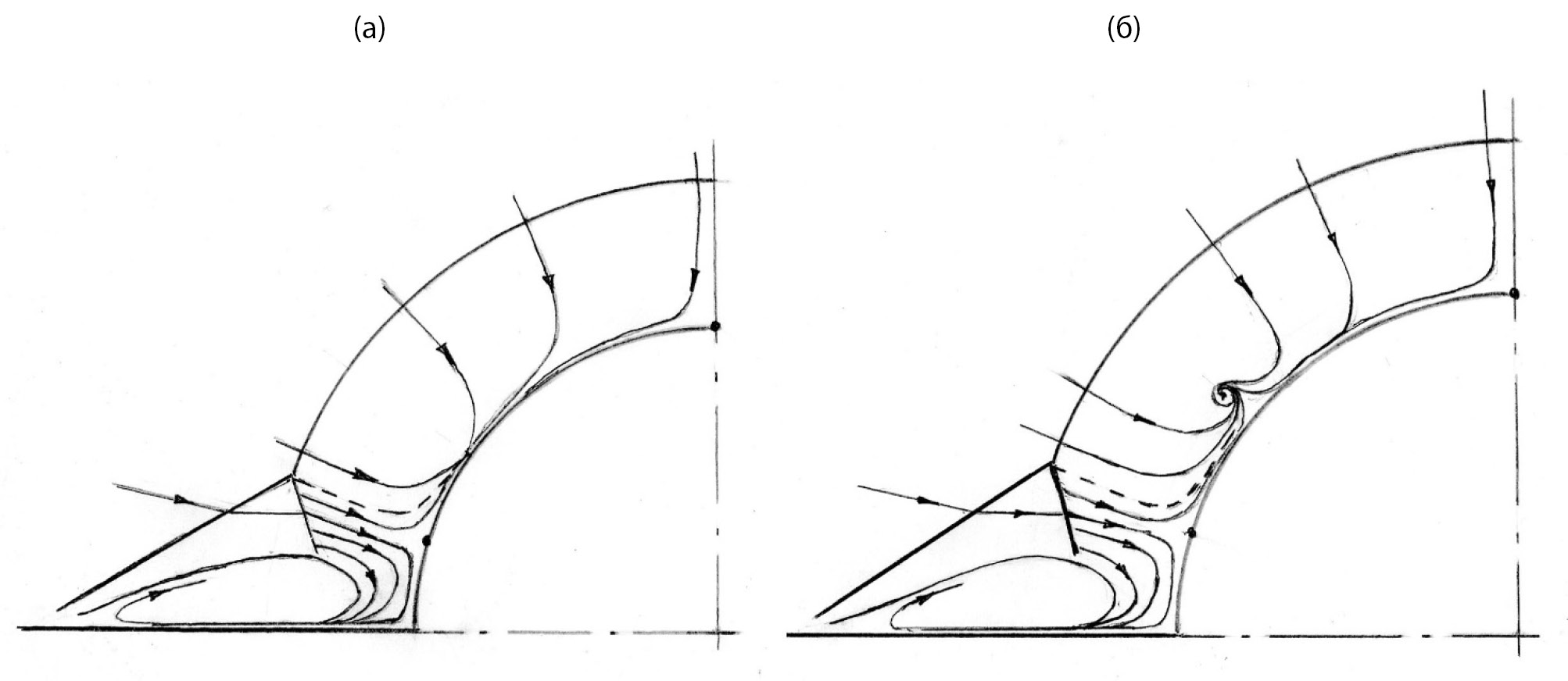 На основании имеющихся данных можно предложить возможные схемы (рис. 7) симметричного обтекания полуконуса на пластине под нулевым углом атаки, где изображены ударно-волновые конфигурации и картины линий тока (в плоскости Z = 1), когда в ударном слое существует либо стандартная (рис. 7а) либо вихревая (рис. 7б) особенности Ферри. Образование в плоскости симметрии течения на поверхности конуса линии растекания с необходимостью следует из-за существования двух особых линий на его боковой поверхности (линий растекания и стекания), появление которых, в свою очередь, связано с образованием на пластине области отрыва с сопутствующей λ-конфигурацией ударных волн и контактным разрывом, исходящим из ее точки ветвления.