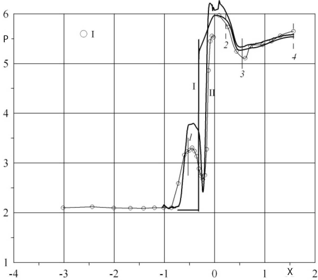 Вторым фактором, который может оказывать существенное влияние на течение в ударном слое около центрального тела, является появление в поле течения контактного разрыва, исходящего из тройной точки λ-конфигурации ударных волн, сопутствующей области отрыва на пластине. Располагая представленными выше экспериментальными данными, в частности, о положении тройной точки λ-конфигурации ударных волн, сопутствующей области отрыва на пластине, распределении давления на пластине, возможно провести расчет параметров в тройной точке и интенсивности контактного разрыва, используя методику разработанную и апробированную [2, 3].