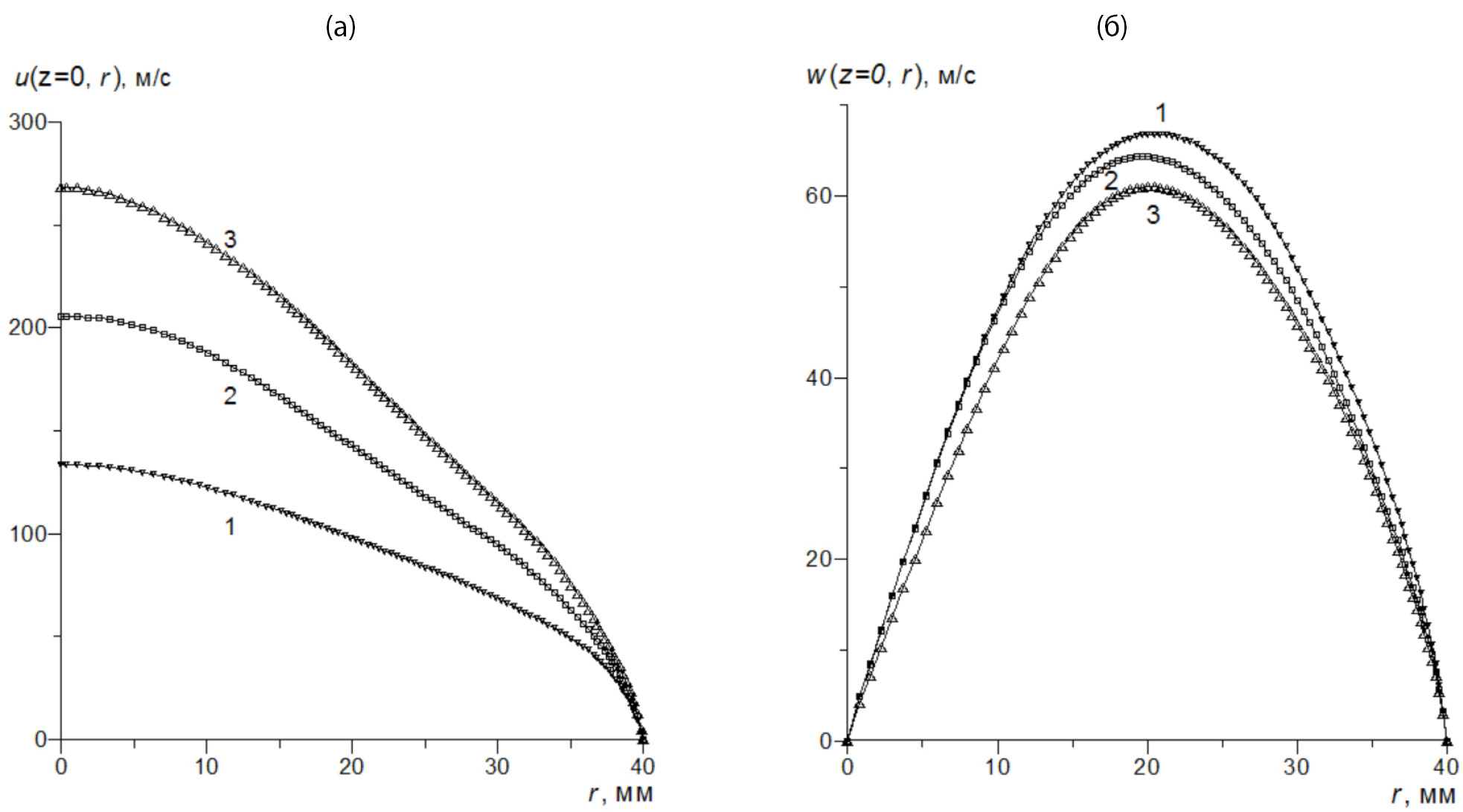 Рис. 1. Радиальные профили продольной (а) и тангенциальной (б) компонент скорости на срезе разрядного канала для трех значений мощности Nap: 1 — 3 — Nap = 30, 50 и 70 кВт.
