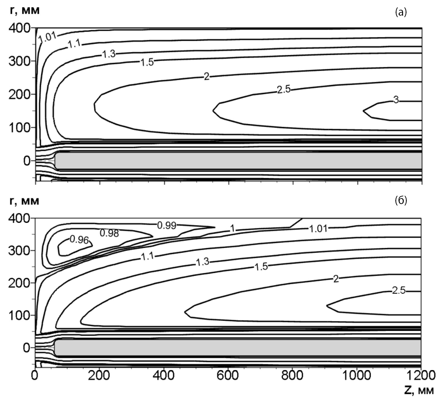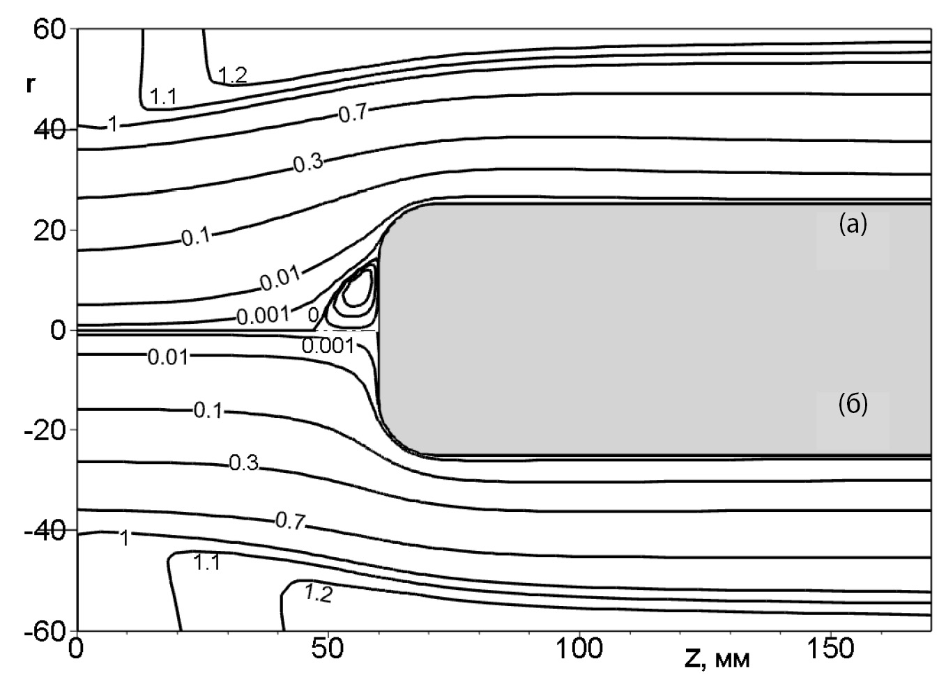 Рис. 5. Изолинии безразмерной функции тока во всей расчетной области для режима Nap = 30 кВт, Zm = 60 мм: (а) — расчет с учетом закрутки; (б) — расчет без учета закрутки.