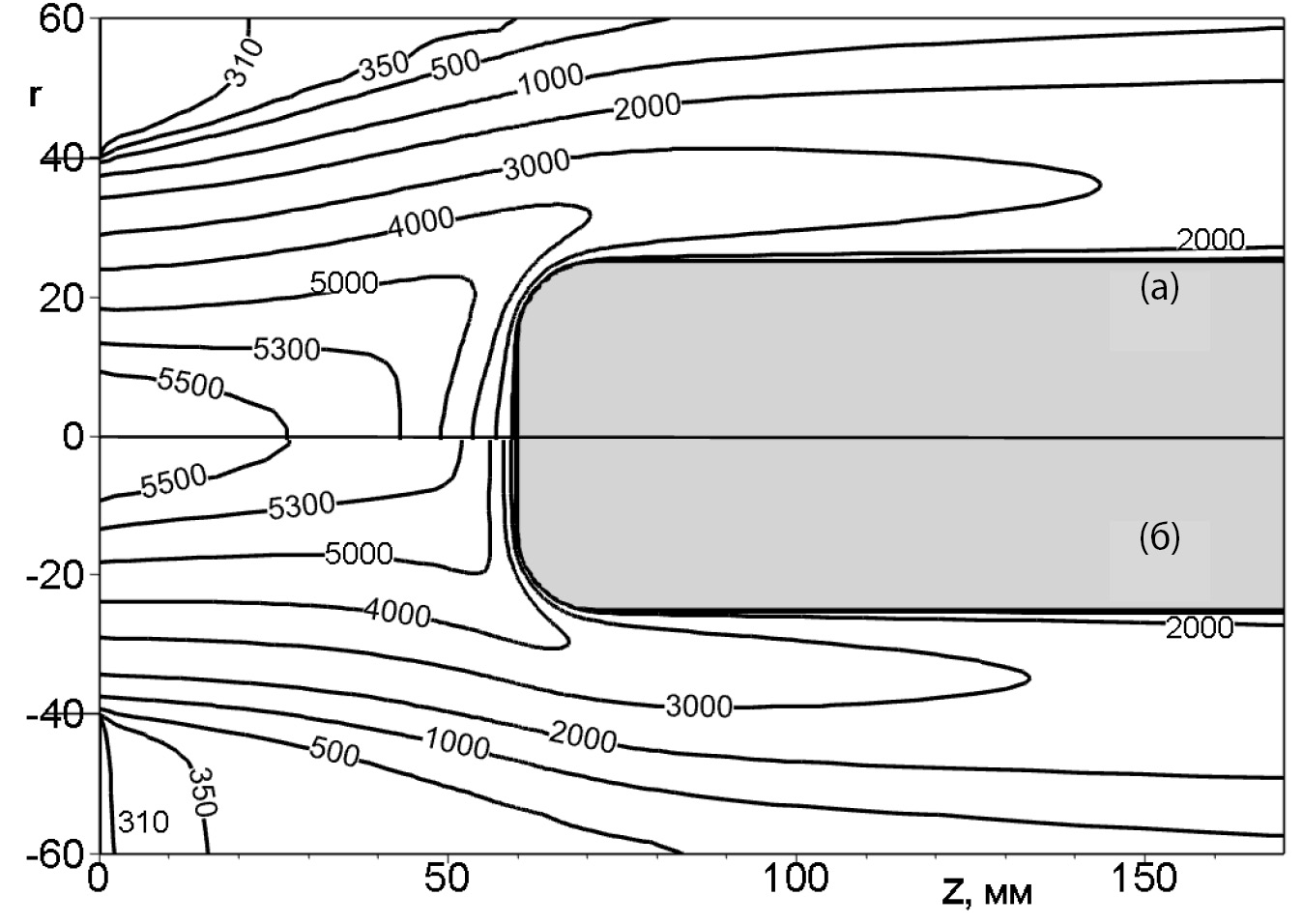 Далее представлены результаты расчетов по программе WBeta и их сравнение с расчетами без учета закрутки. На рис. 2 показаны изолинии безразмерной функции тока f (z, r), отнесенной к своему значению на стенке канала, в ядре струи для случая обтекания модели, расположенной на расстоянии Zm = 60 мм от среза разрядного канала плазмотрона, для режима малой мощности Nap = 20 кВт. Здесь и далее все расчеты проведены для давления P = 80 мбар. Верхняя часть рис. 2а — расчет с учетом закрутки, перед моделью при z > 50 мм образуется вихревая зона с отрицательными значениями функции тока и продольной компоненты скорости. Нижняя часть рис. 2б — расчет без учета закрутки, перед моделью нет вихревой зоны, а имеется относительно тонкий пограничный слой, функция тока и продольная компонента скорости положительные или равны нулю. На рис. 3 показаны изотермы T [K] при обтекании модели для того же режима, что и на рис. 2, с аналогичными обозначениями; а и б — результаты расчетов с учетом и без учета закрутки.