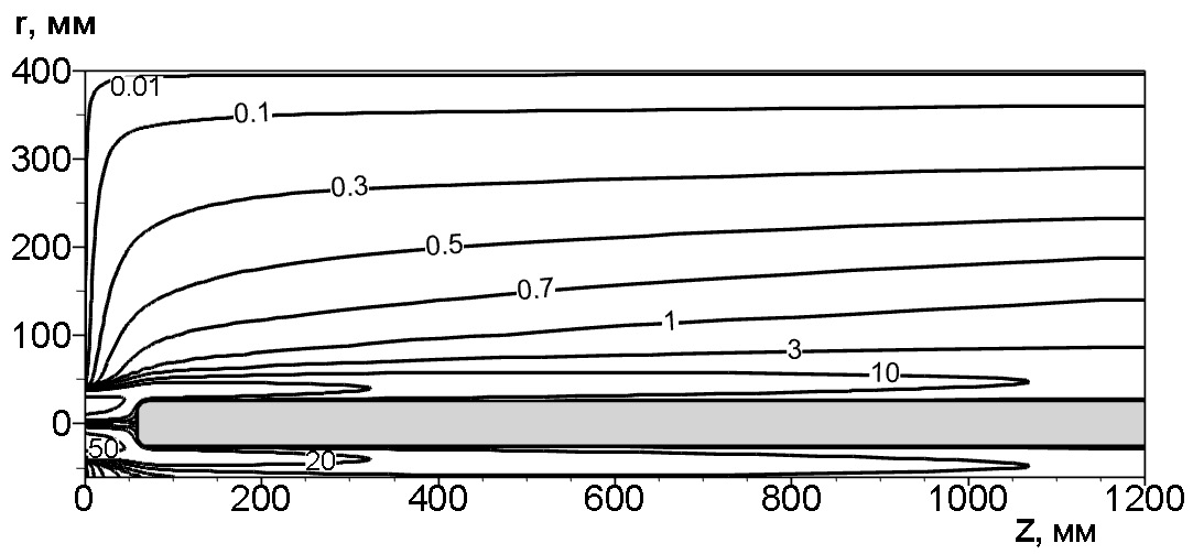 Рис. 4. Изолинии тангенциальной компоненты скорости w (z, r) [м/с] во всей расчетной области для режима Nap = 30 кВт, Zm = 60 мм.