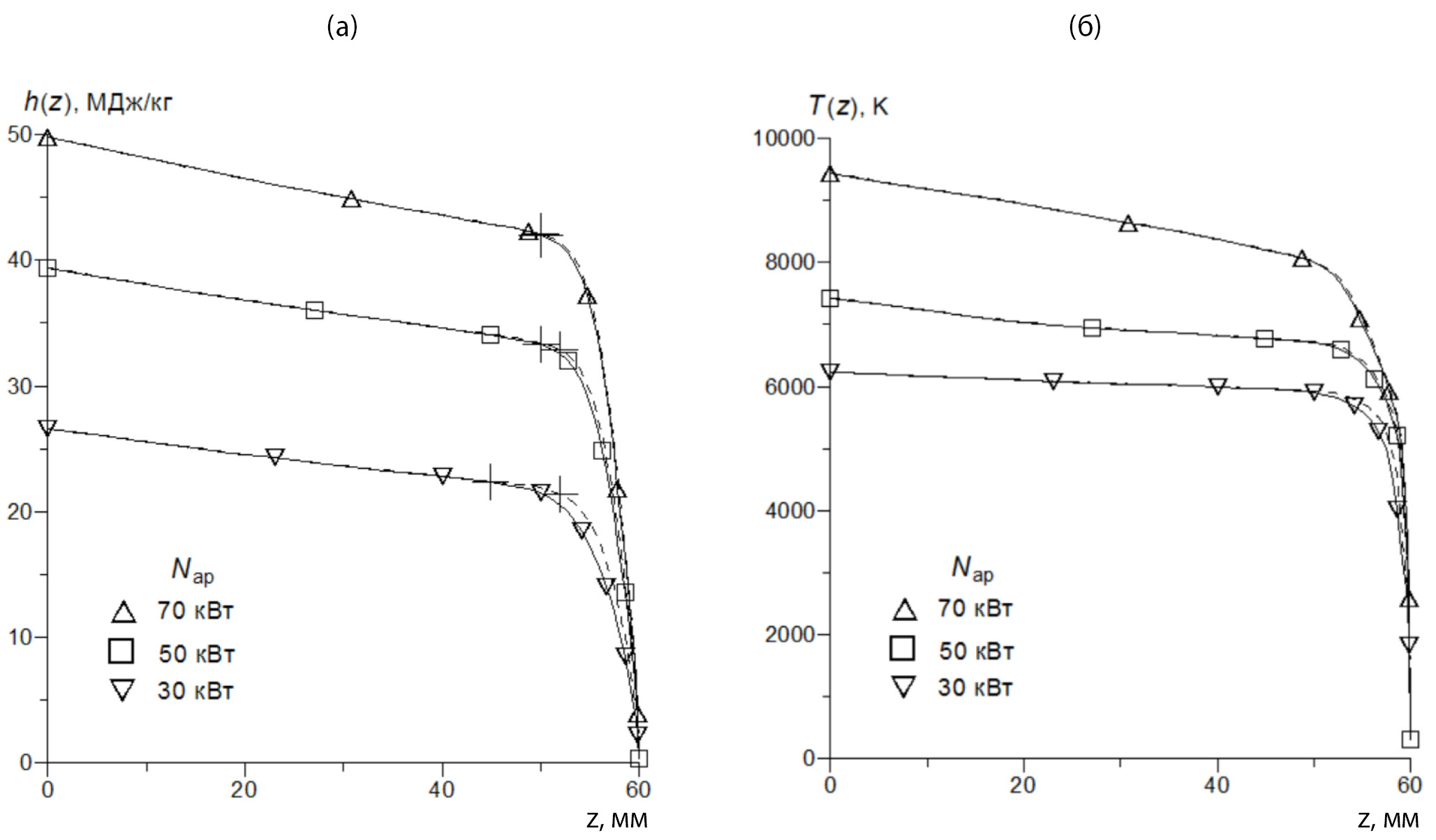 На рис. 6 показано распределение энтальпии h (z, 0) [МДж/кг] и температуры T(z, 0) [K] вдоль оси симметрии от среза разрядного канала до переднего торца модели для трех режимов Nap = 30, 50, 70 кВт, Zm = 60 мм. Сплошными кривыми показаны расчеты с учетом закрутки, штриховые кривые — расчеты без учета закрутки. Учет закрутки практически не влияет на распределение энтальпии и температуры вне области пограничного слоя, а в области начала пограничного слоя при мощности Nap = 30 кВт энтальпия и температура, полученные без учета закрутки, являются немного завышенными. При Nap ≥ 50 кВт учет закрутки практически не влияет на энтальпию и температуру в том числе и в области пограничного слоя. На рис. 6а символами “+” обозначено положение условной внешней границы пограничного слоя Ze для соответствующих расчетов. Толщина пограничного слоя d = Zm – Ze, Zm = 60 мм, полученная в расчетах без учета закрутки, оказывается заниженной для Nap = 30 и 50 кВт, а для Nap = 70 кВт положение внешней границы пограничного слоя совпадает в расчетах с учетом и без учета закрутки.