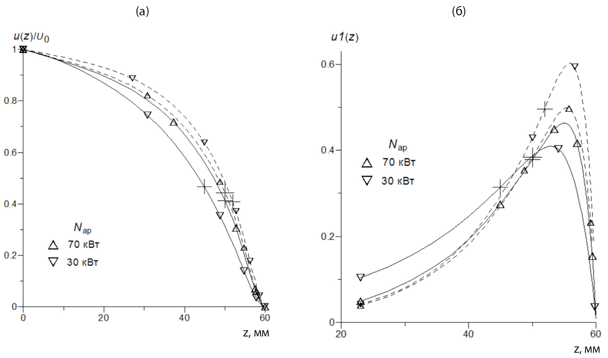 На рис. 7а, б показаны распределения безразмерных параметров u (z, 0) / U0 и u1 (z) для режимов Nap = 30 и 70 кВт; здесь U0 — скорость потока на срезе разрядного канала на оси симметрии, u1 (z) определяется формулой (1.5). Сплошными и штриховыми кривыми показаны расчеты с учетом и без учета закрутки. Символами “+” на кривых обозначена условная внешняя граница пограничного слоя. Как видно из рис. 6, 7, закрутка потока слабо влияет на распределение энтальпии и температуры вдоль оси симметрии, в то же время влияние закрутки на безразмерную продольную компоненту скорости u (z, 0) / U0 и на градиент радиальной компоненты скорости u1(z) существенно больше. Учет закрутки также существенно влияет на положение внешней границы пограничного слоя Ze, которое определяется из условия максимума производной du1 (z) / dz, т.е. функция u1 (z) вблизи Ze должна быть близка к линейной. Для режима Nap = 30 кВт расчет без учета закрутки дает значение Ze, завышенное на 16%, что соответствует занижению толщины пограничного слоя δ на 46%. С увеличением мощности уменьшается влияние закрутки потока на толщину пограничного слоя δ и на параметры потока h (z), T (z), u (z), u1 (z) на оси симметрии (r = 0).