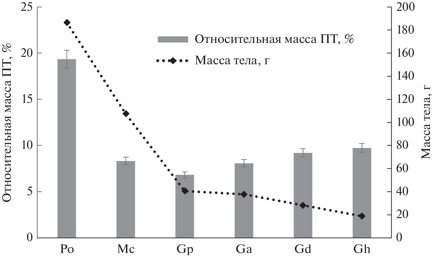 The question of the size ratio of the body and the digestive tract (DT) in small phytophagous mammals is considered on the example of gerbils (Gerbillidae), a group of rodents that is exceptionally convenient for studying such relationships due to significant differences in body weight and morphological homogeneity of the DT. We analyzed the weight ratios of body size and DT, wet weight of contents and tissues of DT in 6 species of gerbils with a 10-fold body weight range (average 18 to 175 g) coexisting in the Negev desert – Psammomys obesus, Meriones crassus, Gerbillus pyramidum, Gerbillus allenbyi, Gerbillus dasyurus Gerbillus henleyi. In a number of studied species of small mammals weighing less than 0.5 kg, no linear relationship was found between body size and DT. The allometry of the considered indicators is mainly due to environmental and physiological factors.
