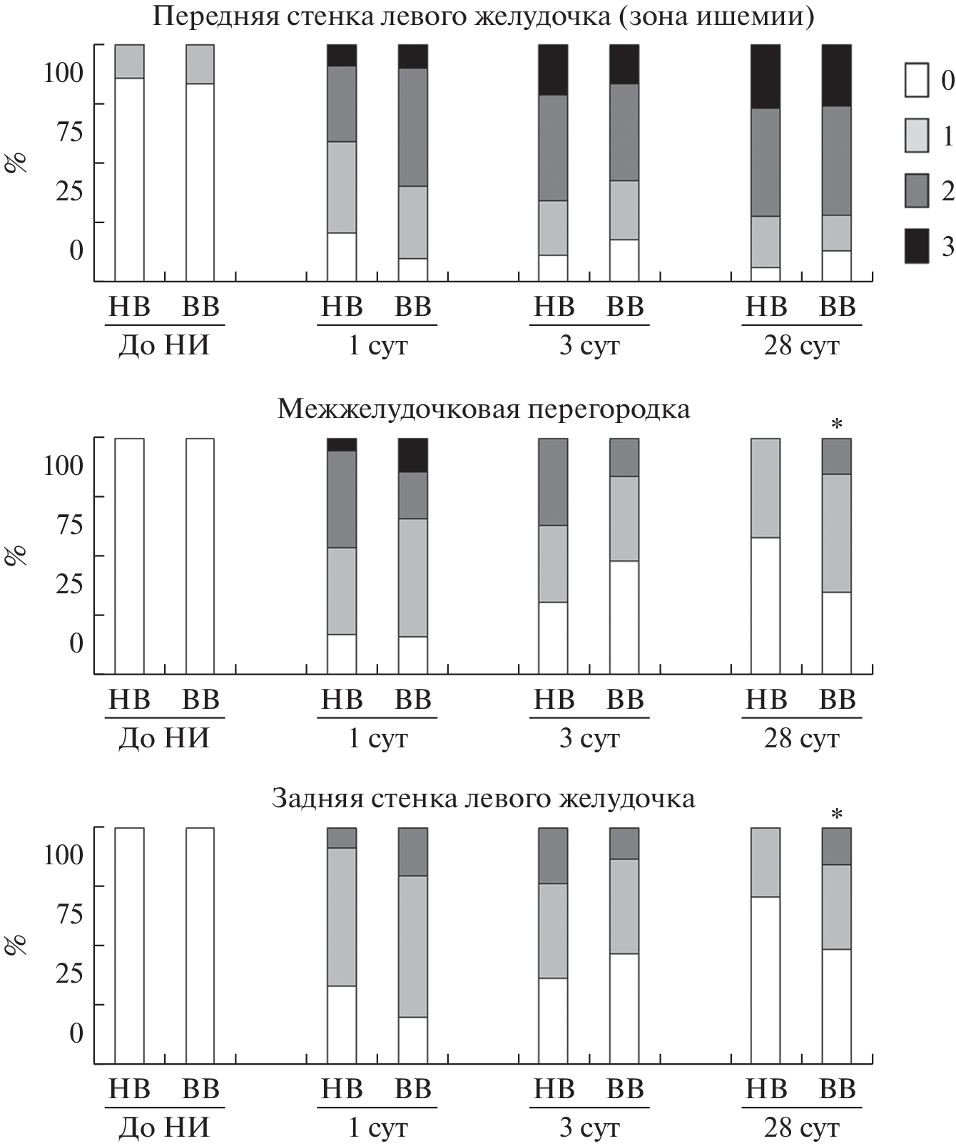 The method of HRV analysis in rats was used to evaluate the relationship between the initial level of total HRV and regulatory changes in the work of the heart before and on days 1, 3, and 28 after the modeling of irreversible ischemia (II). According to the level of total HRV, rats were divided into two groups: with initially “low” and “high” levels of HRV, the LV (SDRR = 5.0 ms) and HV (SDRR = 8.2 ms) groups. LV and HV rats reacted differently to the cold test before and after II. Three days after II, LV rats had a better preservation of the autonomic regulation of the heart, and 28 days later, a smaller size of myocardial damage and mortality. In HV rats, the number of mast cells in the ischemic focus was higher, and in the zone unaffected by ischemia, the proportion of degranulated cells was higher than in LV rats.