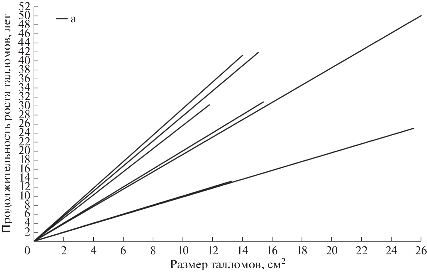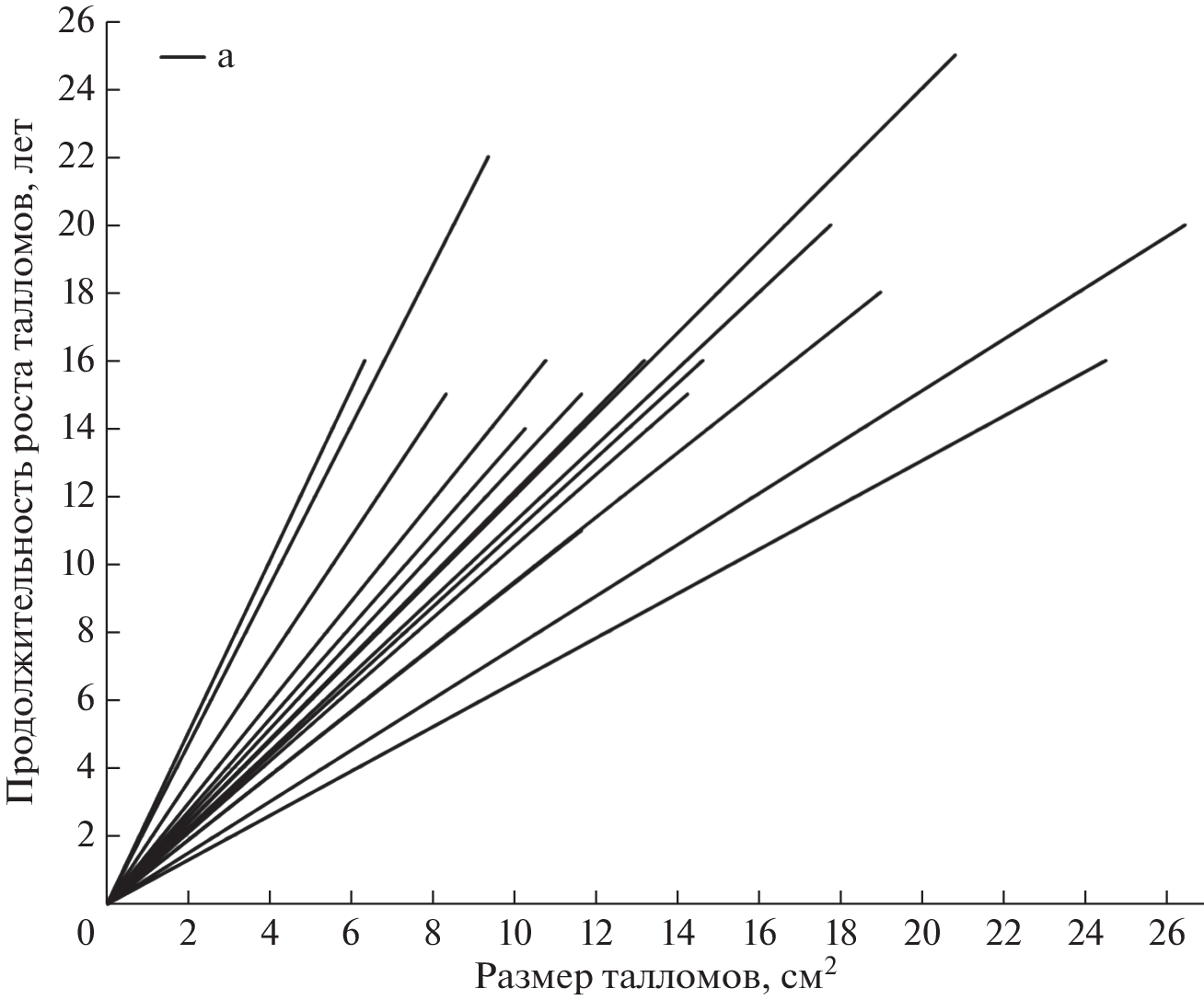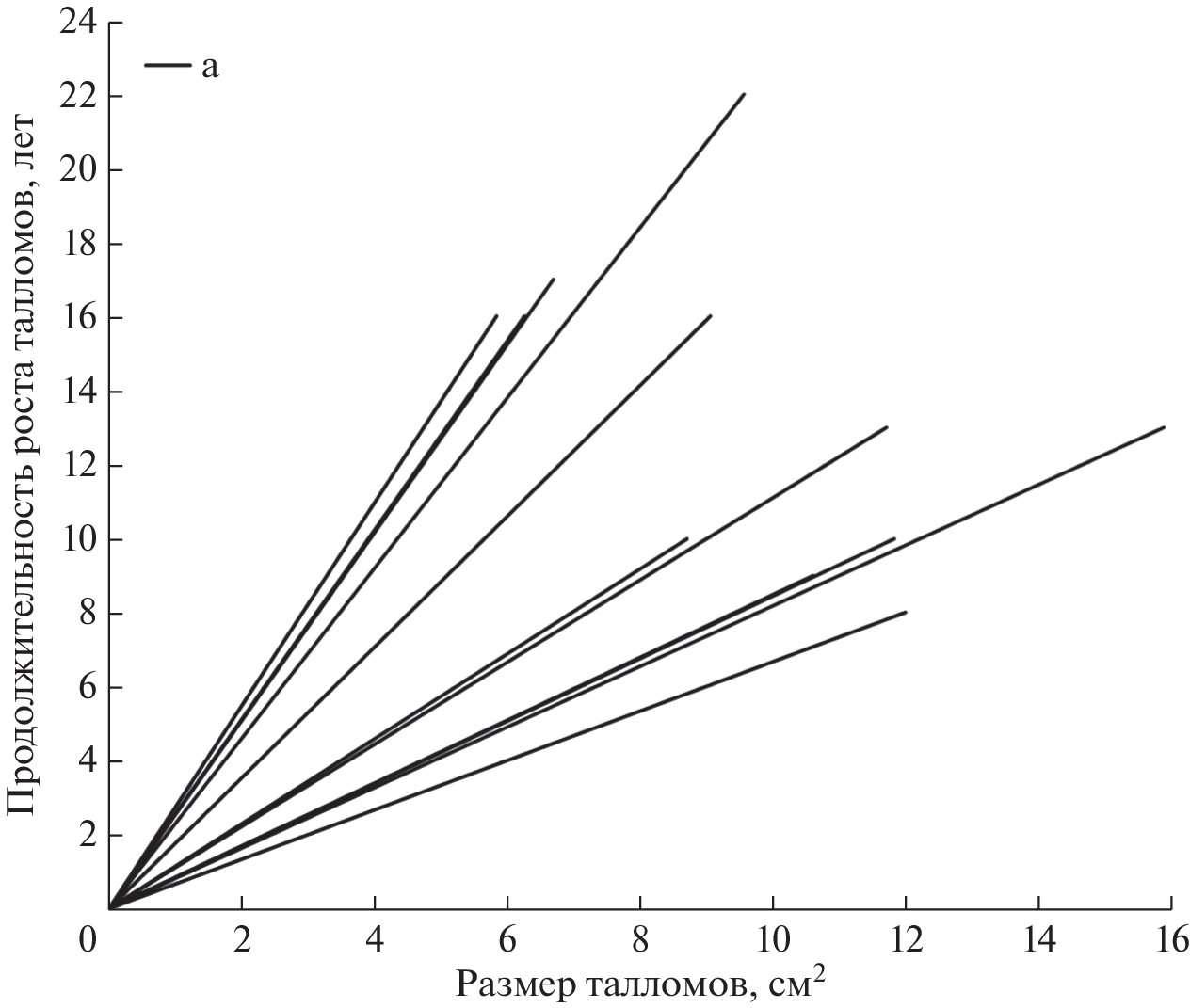 On the territory of the Kivach State Nature Reserve (North-West Russia, the Republic of Karelia) in the supralittoral conditions of the Suna River coast, the growth characteristics of 3 epilithic lichen species – Bellemerea alpina, Lecidea lapicida, Protoparmeliopsis muralis – were studied. Data were analyzed over an 11‑year follow-up period. For each studied thallus, a growth model was created using regression analysis, which reflects the dependence of the area of the thallus on the year of measurement and makes it possible to estimate the age of the thalli. Data were obtained on the size (cm2), growth rate (cm2/year), and age (years) of thalli. For these signs, the confidence interval of the means and the confidence interval of possible values were estimated at a probability of P = 95%.
