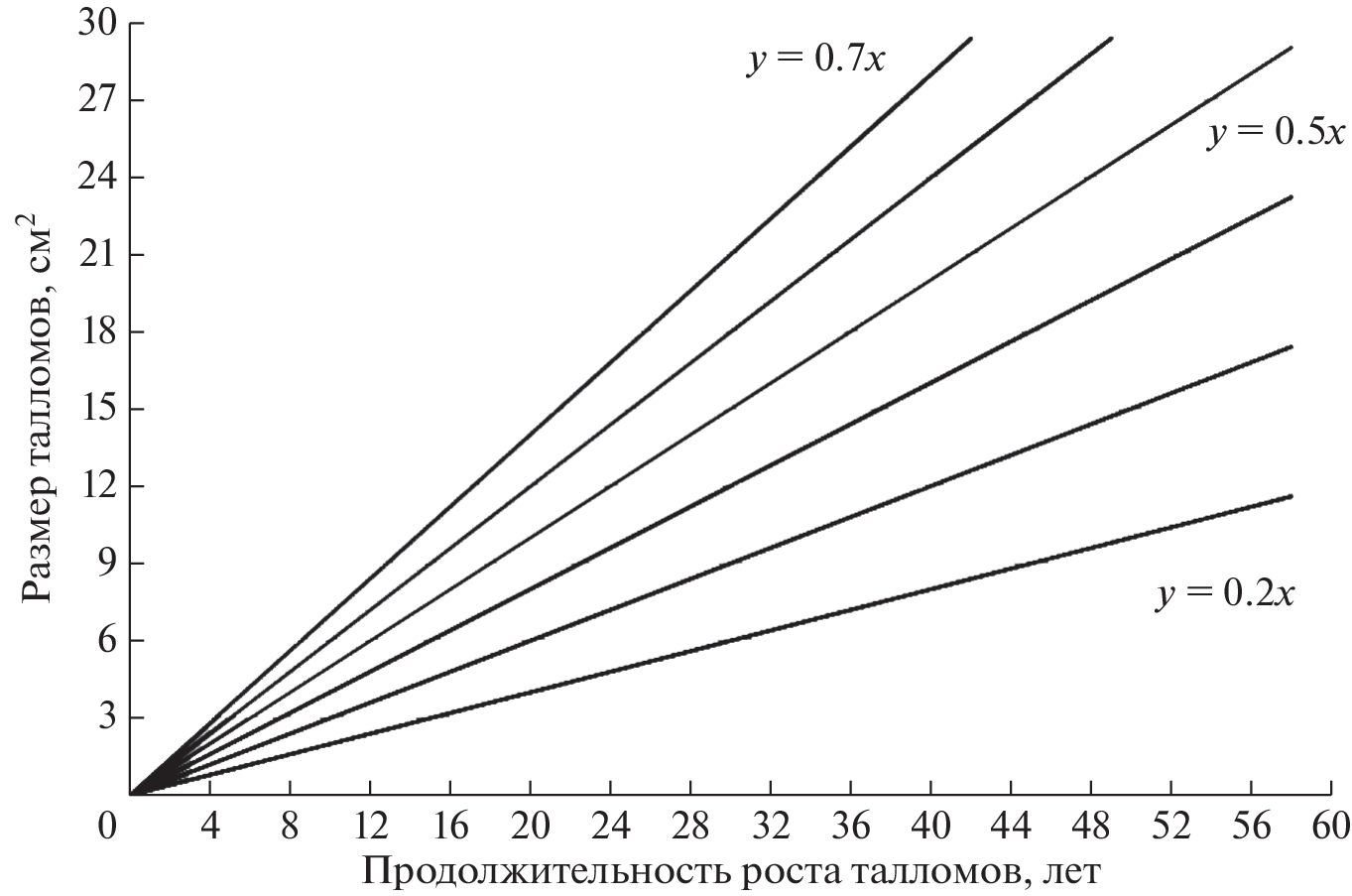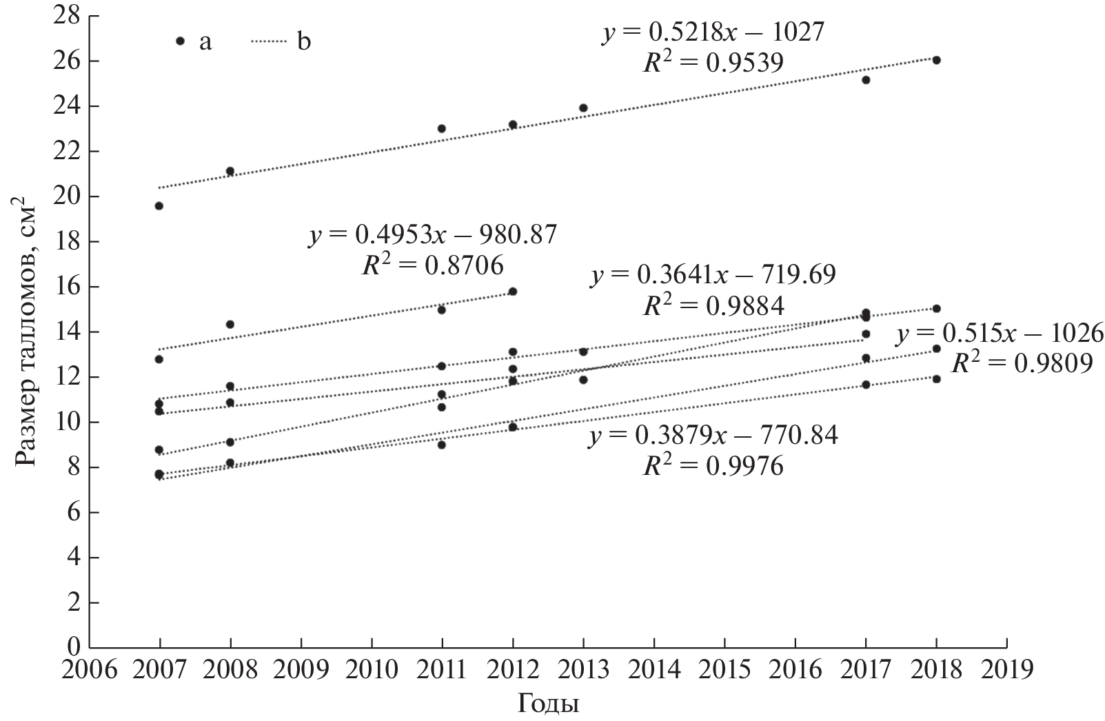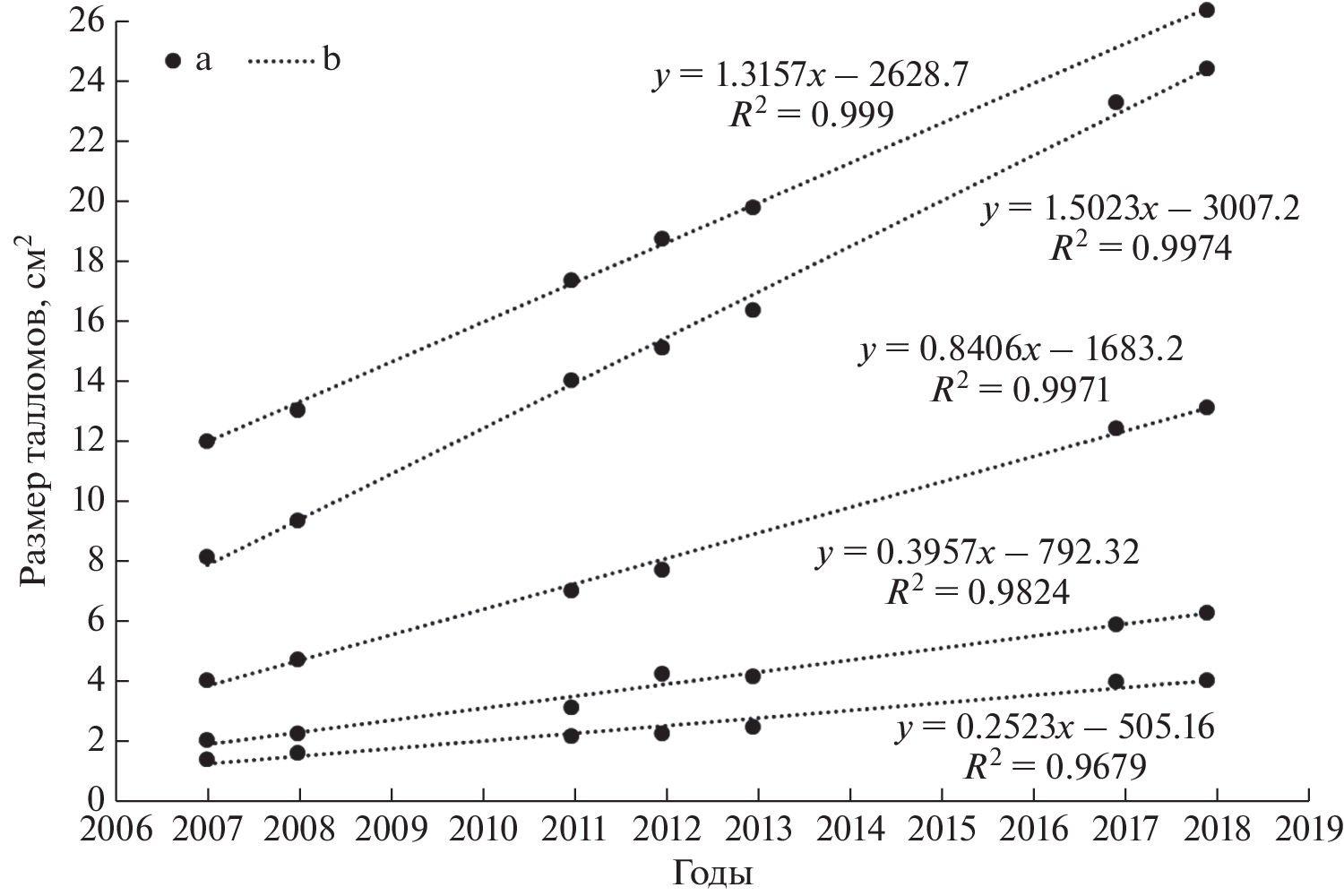 On the territory of the Kivach State Nature Reserve (North-West Russia, the Republic of Karelia) in the supralittoral conditions of the Suna River coast, the growth characteristics of 3 epilithic lichen species – Bellemerea alpina, Lecidea lapicida, Protoparmeliopsis muralis – were studied. Data were analyzed over an 11‑year follow-up period. For each studied thallus, a growth model was created using regression analysis, which reflects the dependence of the area of the thallus on the year of measurement and makes it possible to estimate the age of the thalli. Data were obtained on the size (cm2), growth rate (cm2/year), and age (years) of thalli. For these signs, the confidence interval of the means and the confidence interval of possible values were estimated at a probability of P = 95%.