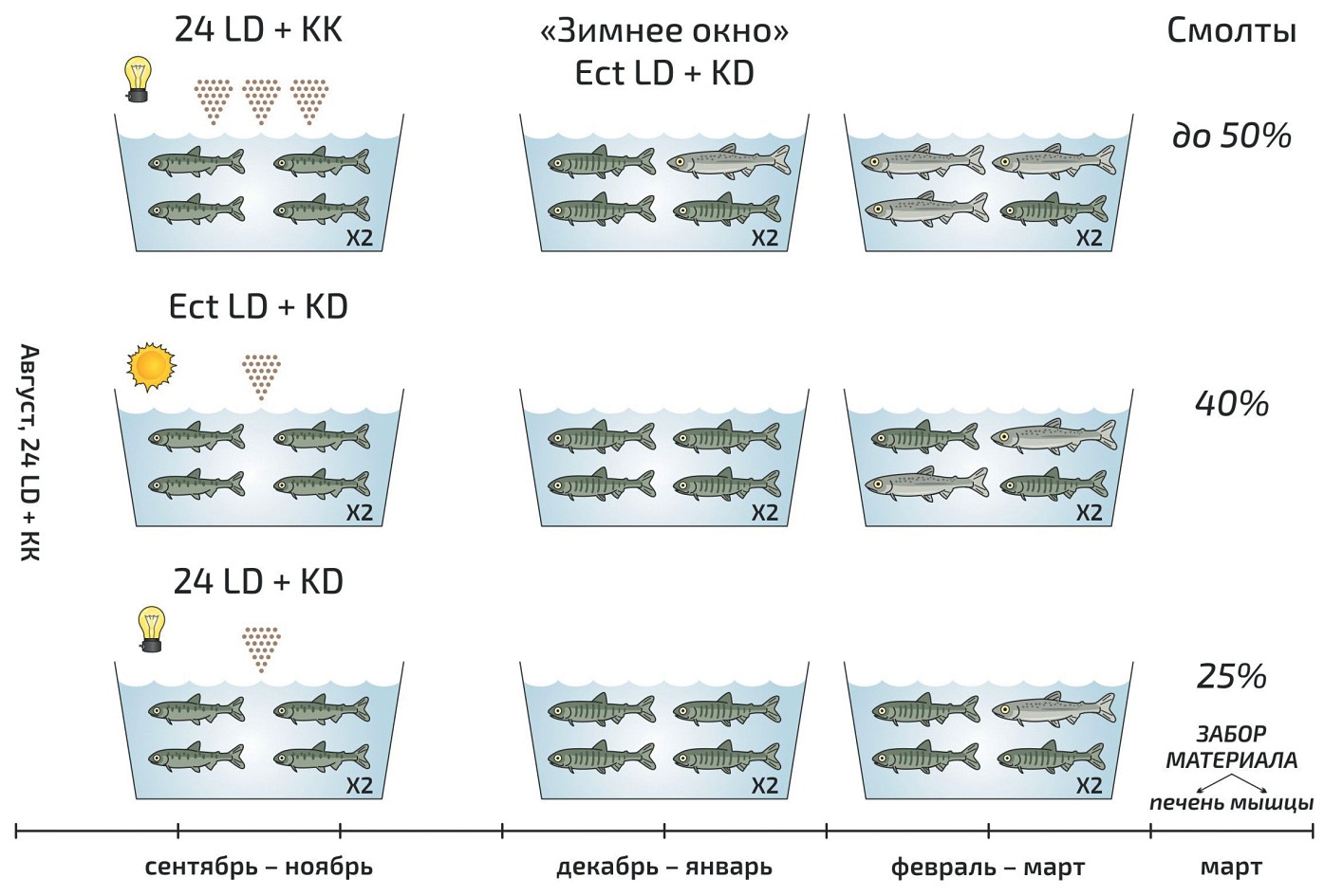 В эксперименте использовали коммерческий корм марки Scretting Nutra HP (Италия) фракция 1,8 (с ноября по февраль) и BioMar Эфико Альфа 790 (Дания) фракция 3 (с февраля по март), оба корма схожи по составу и пищевой ценности; расчет корма проводили согласно нормам возрастной группы и с учетом биомассы. Вода в лотки поступала в объеме 2.7–3 л/с на лоток со скважины, поэтому температурный режим был постоянным и с середины декабря по конец марта составил 10.3–10.8°С. Содержание кислорода в лотках 10.3–10.5 мг утром с постепенным снижением до 8.5–8.2 мг вечером (замеры проводились утром в 07:00 и вечером в 19:00). Отход за период с декабря по март составил 26, 42 и 34% особей в группах 24LD + КК, ЕстLD + КД и 24LD + КД соответственно.