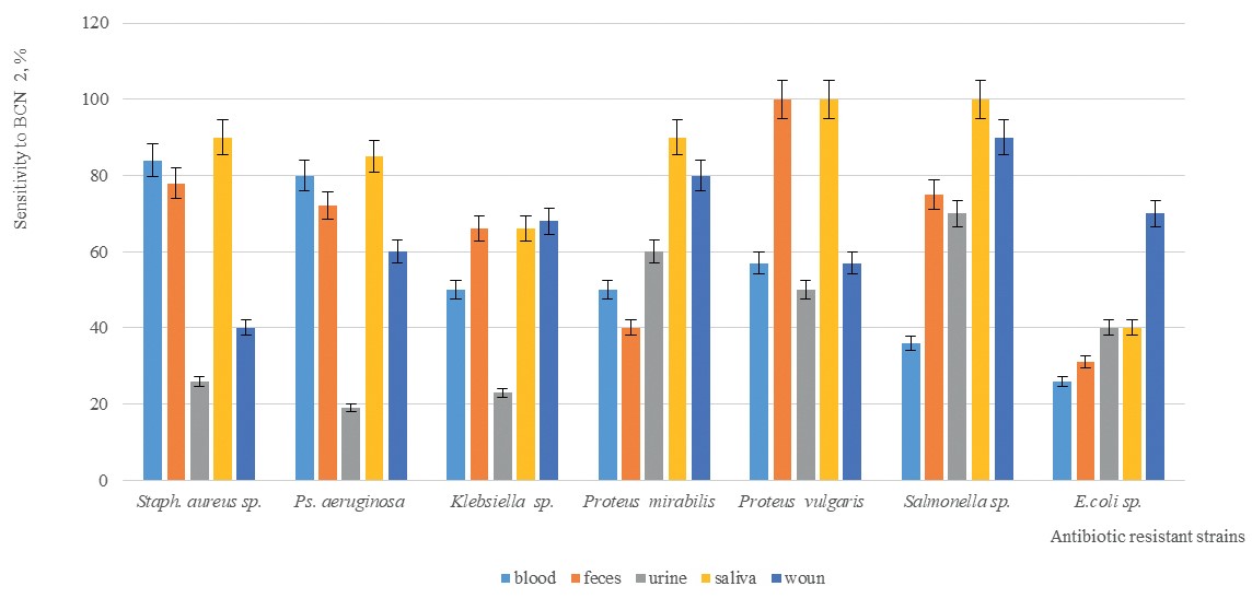 Ранее нами было показано, что очищенные пептиды из пробиотического штамма Lactobacillus rhamnosus BTK 2012 (BCN 1–1470 Dа и BCN 2–670 Dа) и Lactobacillus acidophilus 1991 (BCN-1100 Dа) проявляют антимикробную активность в отношении грамотрицательных и грамположительных возбудителей, таких как Salmonella sp., Escherichi coli, Proteus mirabilis, Pasteurella sp., Clostridium sp., Streptococcus sp., Staphylococcus aureus, Shigella sp., а также ряда устойчивых к антибиотикам возбудителей. Эффективность различалась в зависимости от вида возбудителя, а также источника выделения (кровь, фекалии, моча и др.) (Tkhruni et al., 2013, 2015). Влияние белка-бактериоцина (BCN 2–670 Да) КЖ L. rhamnosus BTK 2012 на рост полирезистентных патогенных бактерий, выделенных от инфицированных пациентов (различные источники, такие как кровь, фекалии, слюна и моча), представлено на рис. 6.