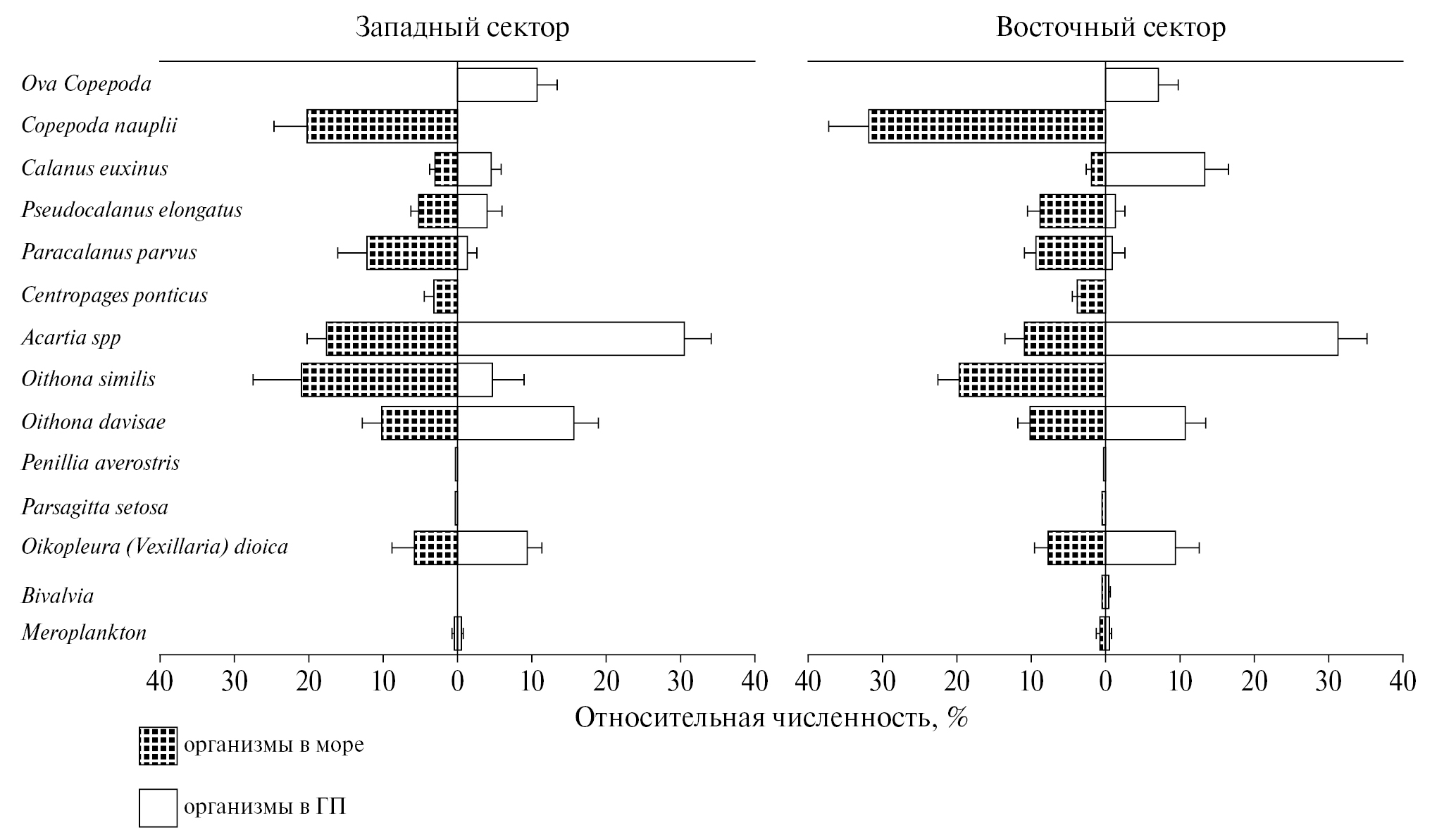 Средняя численность мезозоопланктона была выше в восточном секторе, где чаще встречались науплиусы копепод и старшие возрастные стадии копеподы Pseudocalanus elongatus, а также аппендикулярия Oikopleura (Vexillaria) dioica. Науплиусы копепод доминировали повсеместно и составляли 20% численности мезоопланктона на западе и до 32% – на востоке (табл. 2). Кроме того, в обоих секторах наблюдалась высокая численность циклопоидной копеподы Oithona similis, близкая к 20% всей численности организмов. Другой циклопоидный вид – O. davisae встречался в море реже и имел относительную численность в исследуемых районах около 10% (табл. 2). Копеподы Acartia spp. занимали субдоминирующую позицию по численности и были представлены двумя морфологически сходными видами: Acartia clausi и Acartia tonsa. Суммарная численность других таксономических групп и видов мезозоопланктона не превышала 8% от всех организмов.