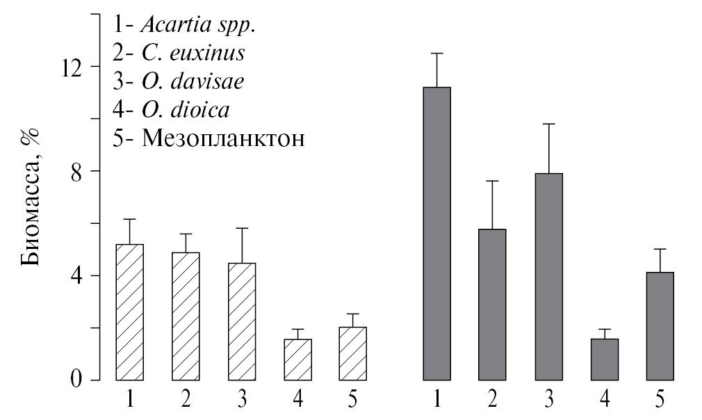 Зависимое от многих факторов (состав, биомасса, распределение организмов и пр.) ежесуточное выедание гребневиком M. leidyi массовых видов мезозоопланктона в западном и восточном глубоководных секторах моря колебалось в пределах 1.5–11.0% биомассы потенциальных жертв (рис. 6).
