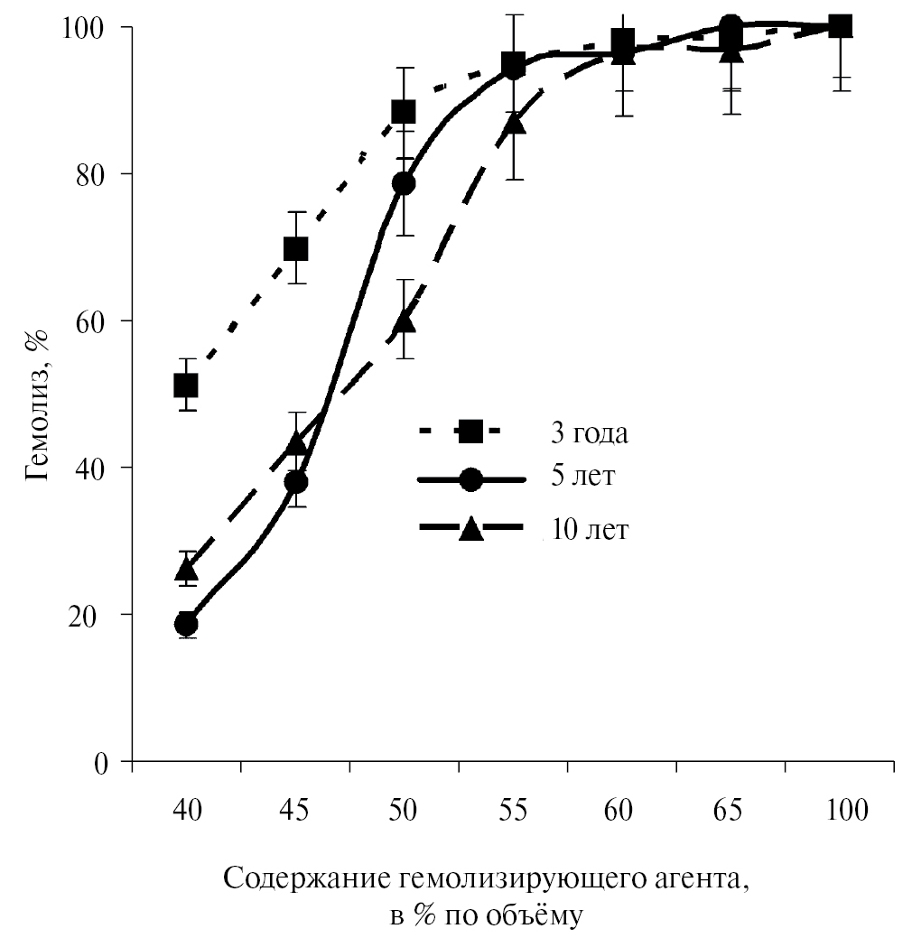 Эритроциты морских зайцев так же, как и у других видов морских млекопитающих (Ерохина, Кавцевич, 2007), более чувствительны к гемолизирующим воздействиям по сравнению с наземными животными и человеком, что выражается в сдвиге кривой гемолиза влево. Количество гемолизированных эритроцитов достигает от 18 до 50% в разных возрастных группах даже при минимальном содержании гемолизирующего агента, тогда как для эритроцитов человека этот показатель в норме не более 3% (Камышников, 2000). При этом ОСЭ изменяется в процессе развития животных, повышаясь с возрастом (рис. 1). В наибольшей степени возрастные различия в чувствительности эритроцитарных мембран к гемолизу проявляются при низких концентрациях гемолизирующего агента (40‒50% по объему). Повышение с возрастом устойчивости эритроцитов к гемолизу вполне объяснимо известным фактом совершенствования процессов регуляции, направленных на контролирование метаболизма с целью быстрой приспособляемости его к условиям окружающей среды.