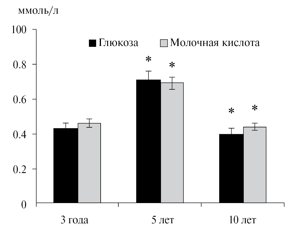Состояние мембран зависит и от внутриэритроцитарного метаболизма. Глюкоза является основным субстратом, а молочная кислота – конечным продуктом гликолиза, единственного пути получения энергии в этих клетках. Содержание глюкозы в эритроцитах морских зайцев находится в пределах 0.40‒0.71 ммоль/л, что существенно ниже, чем у дельфинов-афалин соответствующего возраста, в эритроцитах которых уровень глюкозы достигает 5.06 ± 0.08 ммоль/л (Каганова и др., 2002), и у наземных млекопитающих (4.42 ± 0.55 ммоль/л у крыс) (Скверчинская и др., 2013). Не исключено, что такое низкое содержание связано с выходом глюкозы из эритроцитов для поддержания ее нормального уровня в плазме крови. Однако сведений об этом в литературе не найдено. К тому же известно о роли адсорбционно-транспортной функции эритроцитов в поддержании уровня метаболитов плазмы, когда избыточная часть отдельных соединений адсорбируется на мембране эритроцита и по мере необходимости может транспортироваться обратно в плазму. Наши исследования смывов с эритроцитарных мембран у морских зайцев показали присутствие глюкозы в пределах 0.2‒0.4 ммоль/л (неопубликованные данные), что сопоставимо с данными у других видов млекопитающих. Маловероятно, что для предотвращения критического снижения уровня глюкозы в плазме происходит транспорт ее из внутриэритроцитарного пула. К тому же острой необходимости в этом нет, судя по содержанию глюкозы в плазме исследованных животных (1.9‒5.2 ммоль/л) (Erokhina, Kavtsevich, 2019), сопоставимому с данными (Tryland et al., 2021) для взрослых морских зайцев (2.89‒10.71 ммоль/л). Очевидно, этот вопрос требует дальнейшего изучения. При этом возрастные изменения данного показателя имеют однонаправленный характер – как и у представителя китообразных, у представителя ластоногих морского зайца в старшем возрасте концентрация глюкозы в эритроцитах снижается (p < 0.001) (рис. 2). Отметим заметное (более чем в полтора раза) повышение (p < 0.001) уровня глюкозы к 5-летнему возрасту, очевидно, связанное с общей интенсификацией метаболизма в период полового созревания, и в дальнейшем уменьшение (p < 0.001) значения этого показателя к 10-летнему возрасту. Такие же изменения наблюдаются и в содержании в эритроцитах морских зайцев конечного продукта гликолиза – молочной кислоты (рис. 2).