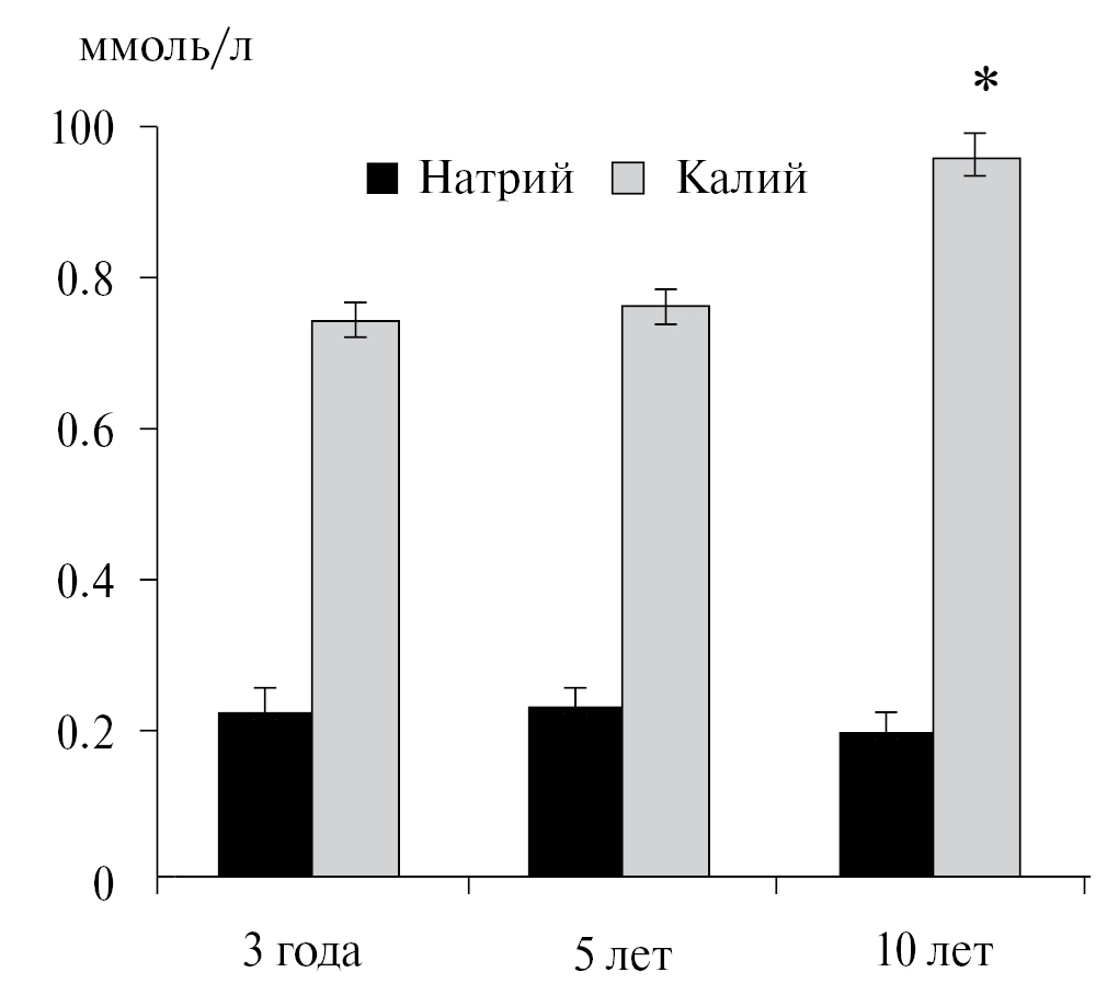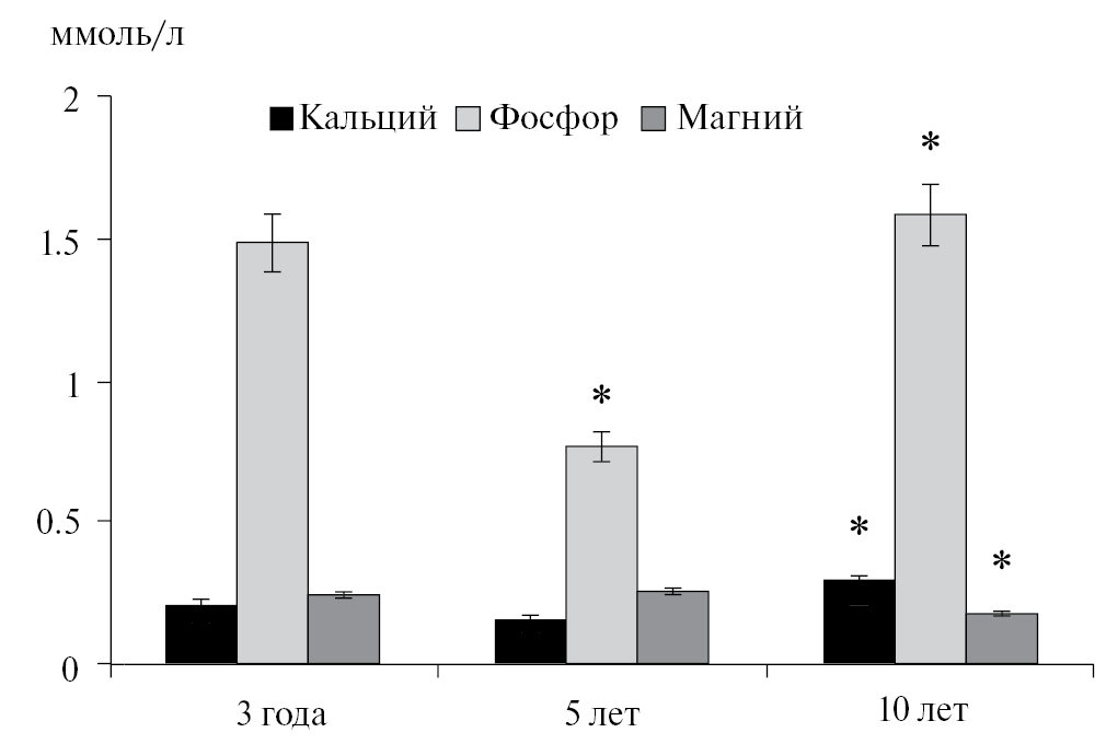 Уровень кальция в эритроцитах морских зайцев статистически значимо увеличивается к 10-летнему возрасту (рис. 4), косвенно указывая на интенсификацию работы калий-натриевого насоса в клетках (Engelman, Duhm, 1987). Содержание фосфора в эритроцитах взрослых животных не отличается от такового в возрасте 3 года, при этом статистически значимо снижается вдвое в период полового созревания (5 лет). Концентрация магния в эритроцитах снижается к 10-летнему возрасту. Как известно (Мисюра, Богданова, 1997), с ионами магния связана часть фосфатных соединений эритроцитов. Магний снижает сродство фосфатов к гемоглобину, тем самым повышая сродство последнего к кислороду. Можно предположить, что кислородсвязывающая способность гемоглобина в эритроцитах молодых животных регулируется магнием, влияние которого снижается к тому моменту, когда эта способность поддерживается за счет высокой концентрации гемоглобина.