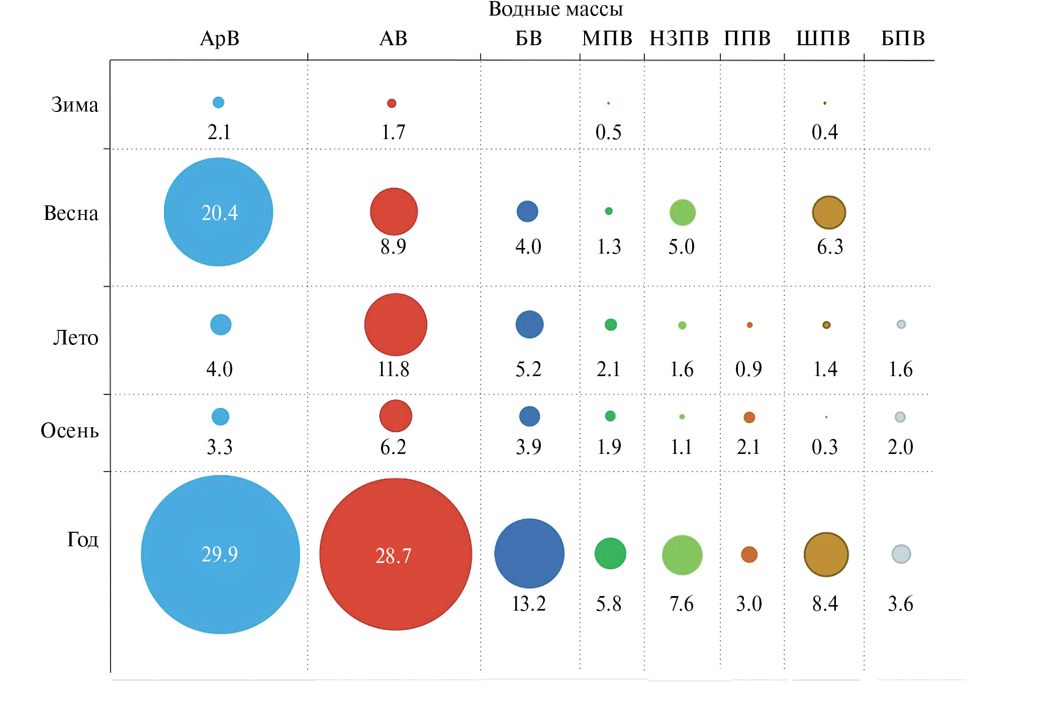 Примечание. Водные массы: АрВ – арктическая, АВ – атлантическая, БВ – баренцевоморская, МПВ – мурманская прибрежная, НЗВП – новоземельская прибрежная, ППВ – печорская прибрежная, ШПВ – шпицбергенская прибрежная, БПВ – беломорская прибрежная.