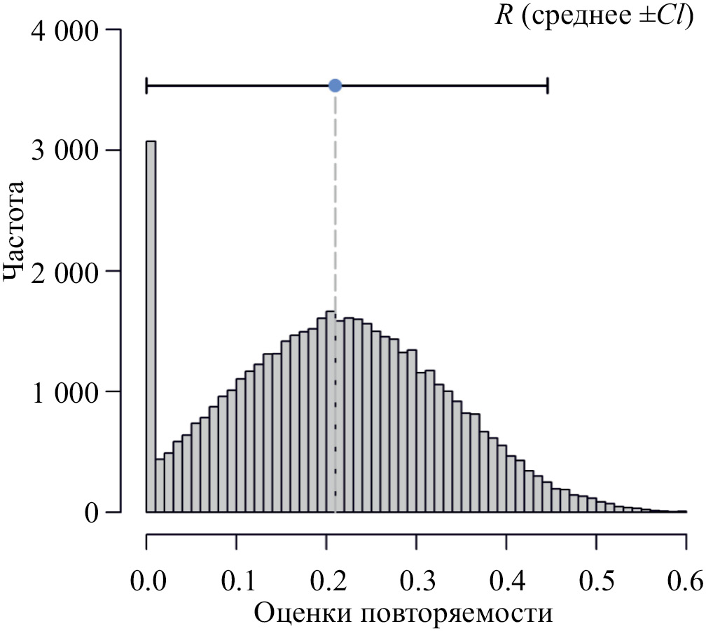 Рис. 1. Результаты бутстрэп-анализа результатов теста 2: R — повторяемость, CI — доверительный интервал