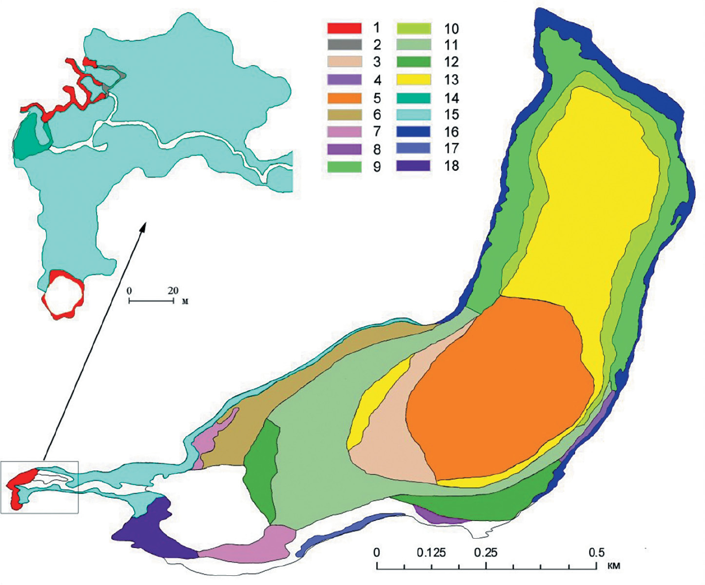 Синтаксономический состав растительности. В оз. Арбакалир и источнике Чарский горячий ключ выделено 12 формаций, 18 ассоциаций (табл. 2, рис. 3)). Настоящая водная растительность представлена 9 формациями и 14 ассоциациями. В гелофитной растительности выделено 3 формации 4 ассоциаций. Ниже приведен перечень выделенных сообществ с их краткой характеристикой. Зарастаемость озера составляет 88 % от его площади.