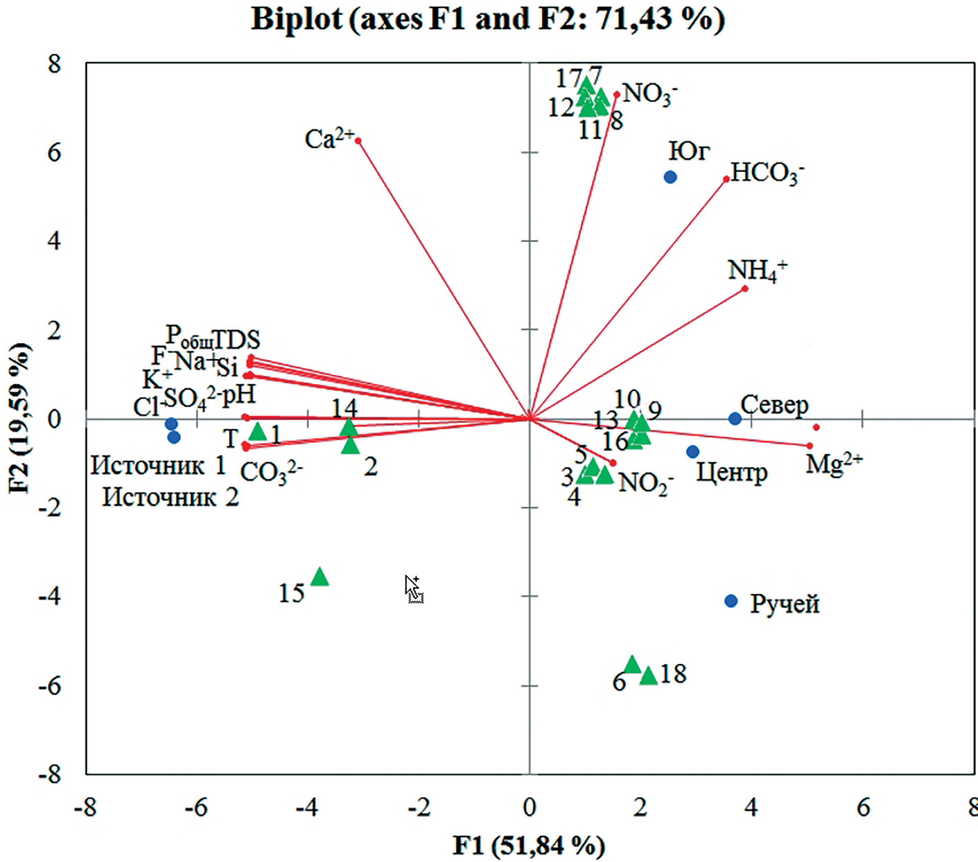 Факторы среды, определяющие растительность. Для выявления ведущих факторов среды, определяющих распределение фитоценозов в исследованных объектах, проведен факторный анализ методом главных компонент. Факторный анализ переменных позволил выделить три главных компоненты, определяющие 84.29 % дисперсии фактических данных. Для визуализации результатов построен масштабированный биграф взаимных расположений станций наблюдений и исследованных переменных (рис. 4). Первая компонента, на долю которой приходится 51.84 % общей дисперсии, характеризуется высокой отрицательной корреляцией с температурой воды, рН, минерализацией, концентрацией CO32–, SO42–, Cl–_, F–, K+, Na+ Si и Pобщ. Положительная связь с концентрацией Mg2, NO3–. Выделенные факторные нагрузки определяют развитие фитоценозов Cyanophytetum, Charetum sp., Lemnetum trisulca, Scrispetum tabernaemontani в источнике Чарский горячий ключ. Вторая компонента (19.59 % дисперсии) характеризуется положительной связью с концентрацией NO3–, Ca2+, HCO3–, NH4+, определяя состав растительности в южном секторе озера. В третью компоненту (12.87 %) объединены фитоценозы центрального и северного секторов.