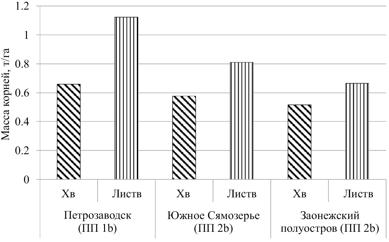 В 65—70-летних сообществах, несмотря на преобладание по запасу хвойных пород над лиственными, масса тонких корней лиственных пород больше. Для ПП 1b разница составляет 41 % (p=0.01). Для ПП 2b и ПП 3b тенденция остается, однако различия между значениями незначимы (рис. 3).
