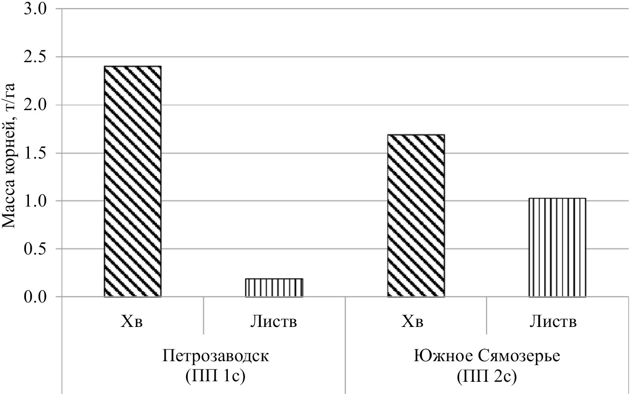 Для начальных стадий зарастания древесными породами (после смыкания крон) характерна высокая внутри- и межвидовая конкуренция (Larocque et al., 2012) за элементы минерального питания, что, в свою очередь, также способствует развитию высокой массы тонких корней (Wang et al., 2002). Кроме того, корни лиственных пород, в том числе березы, ольхи, которые входят в состав молодых сообществ, обладают большей энергией роста по сравнению с хвойными породами (Дегтева, Ипатов, 1987; Зарубина, Коновалов, 2014). Доминирование тонких корней лиственных пород в 65—70-летних древостоях, несмотря на преобладание по запасу хвойных пород над лиственными, также доказывает большую скорость роста корней лиственных пород по сравнению с хвойными и более высокую конкурентоспособность корней лиственных пород (Schmid, 2002).