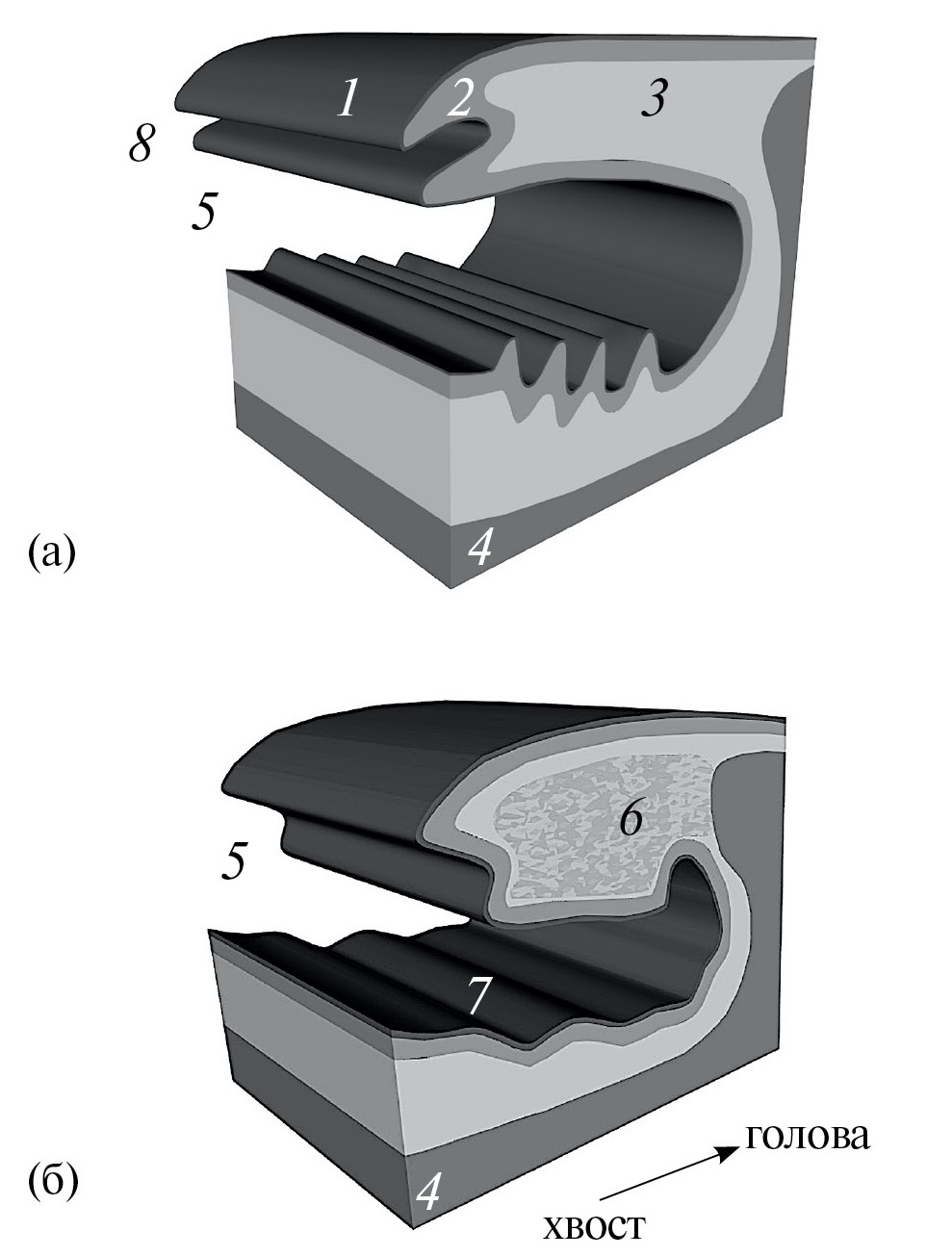 Рис. 7. Схема строения щитков вентральной чешуи взрослых (а) и ювенильных (б) ящериц рода Darevskia: 1 – надкожица (Oberhäutchen), 2 – нижележащие слои эпидермиса и дерма, 3 – подкожная клетчатка с пучками мышечных волокон, 4 – подкожная мускулатура, 5 – полость межчешуйного кармана, 6 – соединительно-тканный клапан, способный запирать полость межчешуйного кармана, 7 – кожные складки донной части межчешуйного кармана, 8 – кожный дивертикул каудального края щитка.