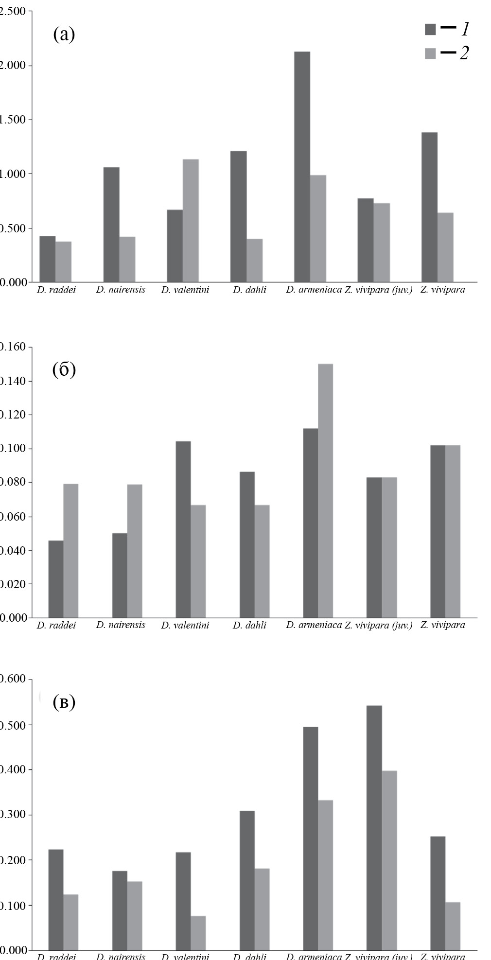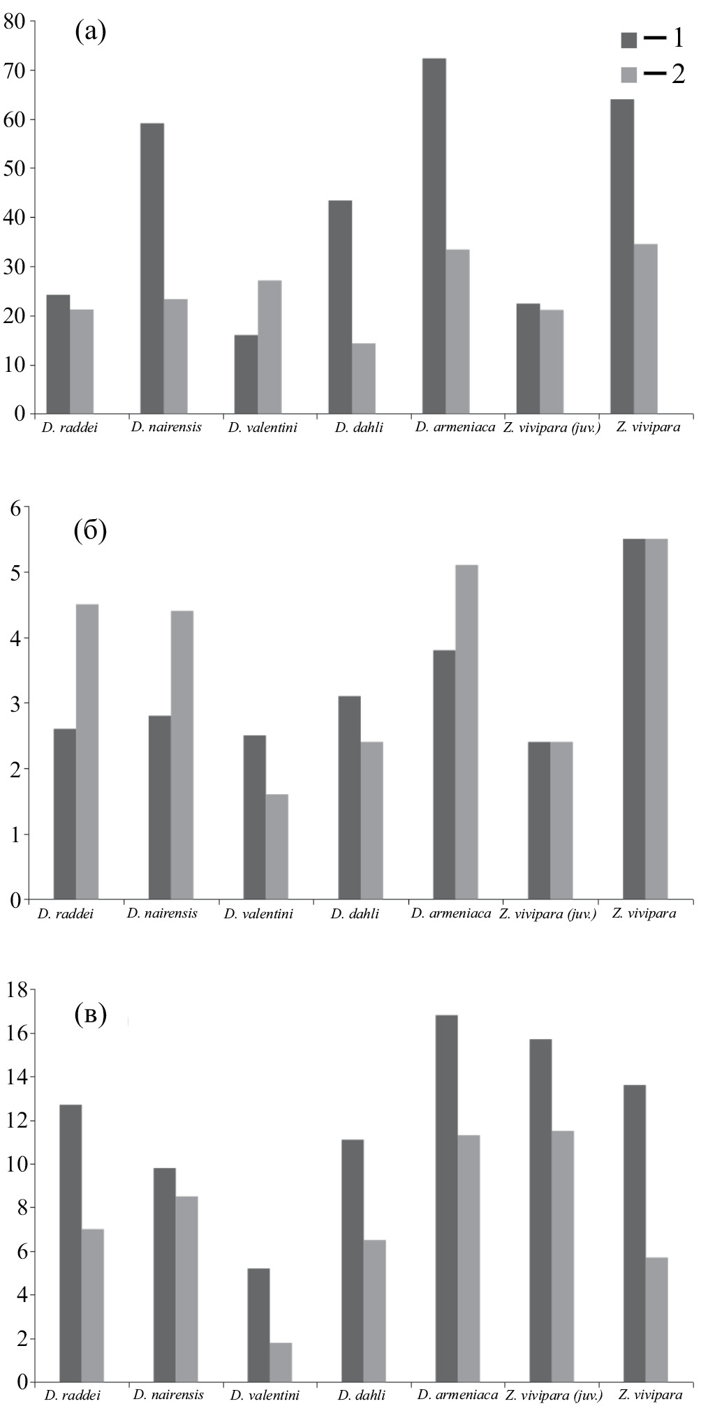 Рис. 8. Абсолютная толщина кожи и различных ее слоев (мкм) на дорсальной (1) и вентральной (2) частях тела исследованных ящериц. Толщина кожи без надкожицы с ß-слоем (а) (здесь приведены данные по толщине кожи у обоих экземпляров Zootoca vivipara), толщина надкожицы с ß-слоем (б), и эпидермиса (в).