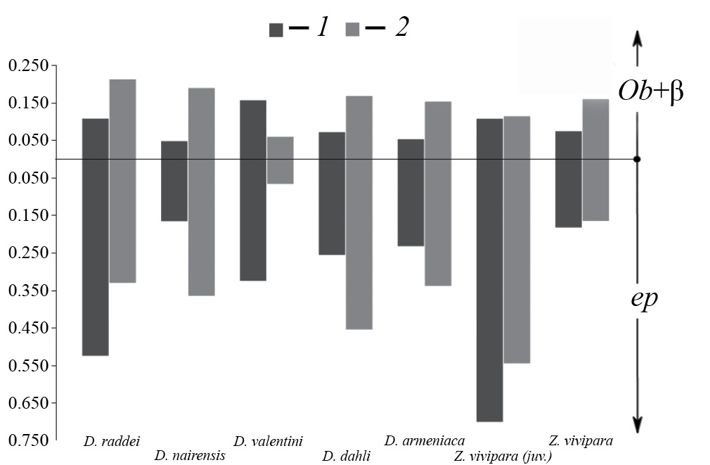 Рис. 10. Толщина надкожицы с ß-слоем (Ob+ß: верхняя часть диаграммы) и эпидермиса (ep: нижняя часть диаграммы) относительно толщины всей кожи на дорсальной (1) и вентральной (2) частях тела исследованных ящериц.