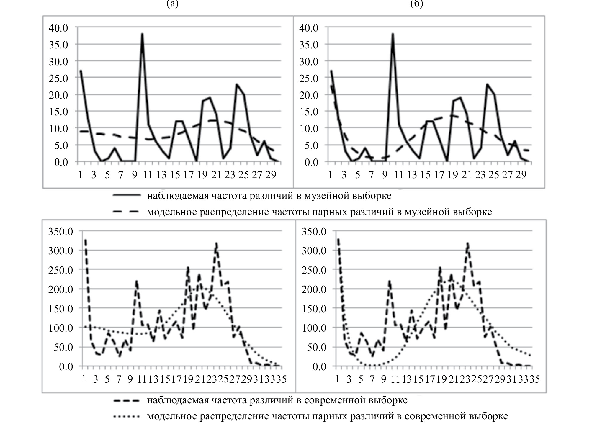 Форма графиков распределения частот парных нуклеотидных различий между гаплотипами (Mismatch distribution), отражающая историю демографических изменений, происходивших в популяциях (Rogers, Harpending, 1992; Rogers, 1995, 1997), имеет неоднородную структуру, включающую несколько пиков (рис. 3). Для обеих выборок был рассчитан индекс Харпендинга (raggedness index, r) (табл. 2). Статистически незначимое значение индекса Харпендинга (Harpending, 1994) подтверждает наличие пространственной экспансии, как для музейных, так и для современных образцов. Признаков демографической экспансии не наблюдалось. Соотношение кривых, построенных по наблюдаемым и моделируемым частотам парных различий для демографической и пространственной экспансий обеих выборок образцов сайгака из популяции Северо-Западного Прикаспия, показано на рис. 3.