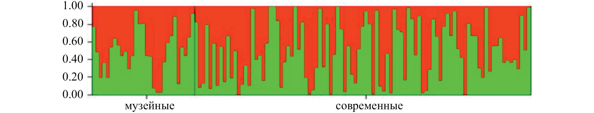 Рис. 4. Кластеризация образцов сайгака из популяции Северо-Западного Прикаспия в программе STRUCTURE 2.3.4. (K = 2).