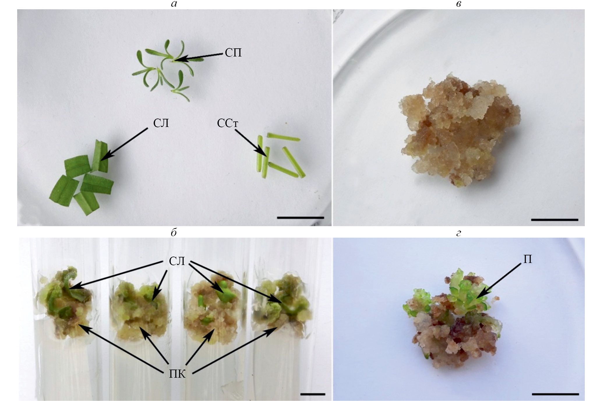 Рис. 1. Экспланты (а), первичные каллусы (б), неморфогенные (в) и морфогенные (г) каллусы 1 пассажа L. angustifolia, полученные из различных эксплантов. Условные обозначения: П – почка, ПК – первичный каллус, СЛ – сегмент листа, СП – сегмент почки, ССт – сегмент стебля. Масштаб: 10 мм.