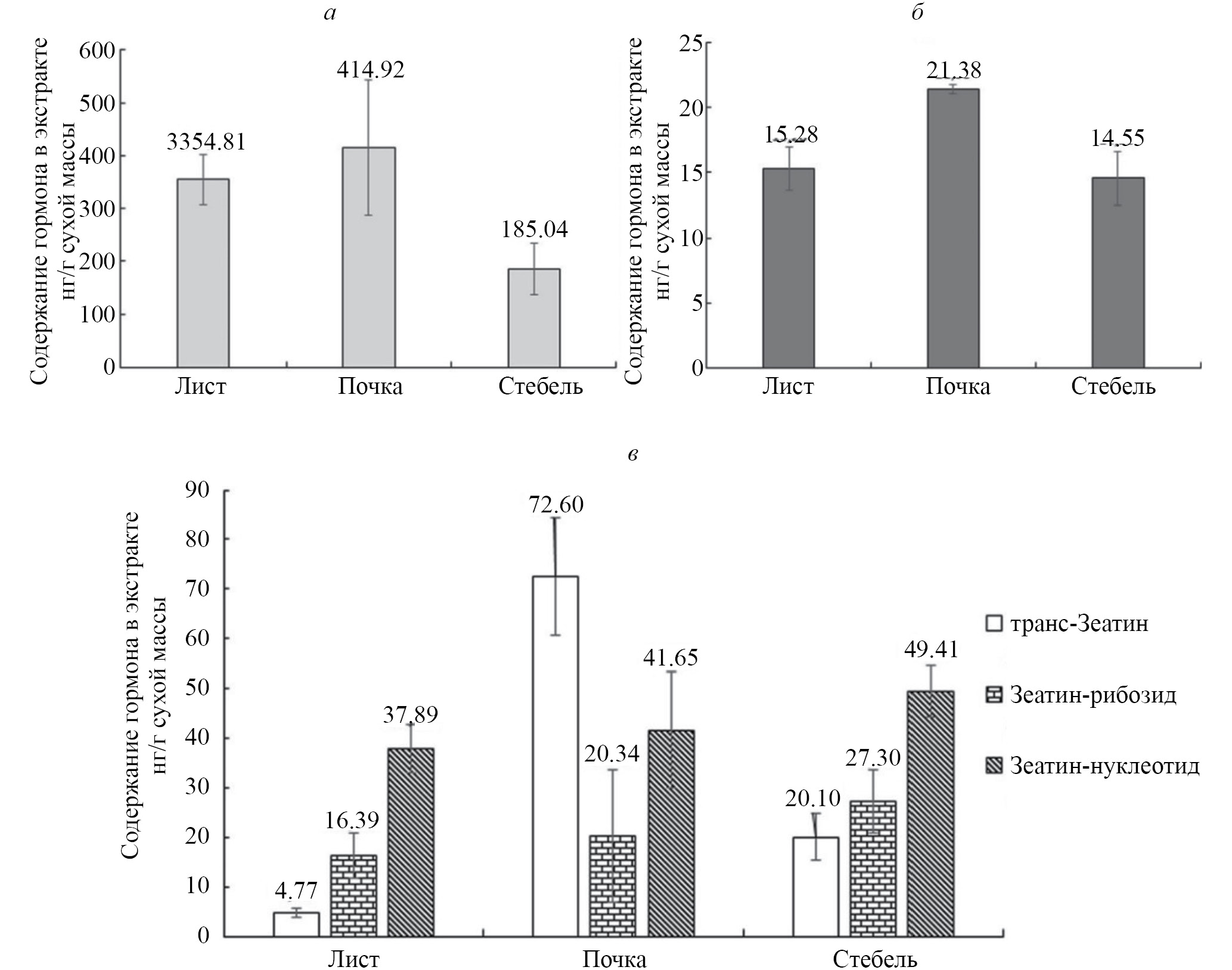 Первичные каллусы L. angustifolia формировались на поверхности различных эксплантов через 2–3 недели после введения в культуру in vitro на питательную среду. По морфологическим показателям первичные каллусы представляли собой рыхлые недифференцированные образования со множеством инвагинаций, как это показано на примере таких каллусов, полученных из сегментов листа (рис. 1б). Результаты выявления содержания эндогенных ИУК, АБК и цитокининов в первичных каллусах представлены на рис. 3. Их анализ свидетельствует о примерно равных уровнях ИУК (2806.50 нг/г, 2563.60 нг/г, 3189.54 нг/г) и АБК (82.33 нг/г, 98.52 нг/г, 88.99 нг/г) в каллусах, полученных из различных эксплантов (лист, почка, стебель, соответственно). В то же время выявлено значительное повышение показателя цитокинина зеатин-нуклеотида в каллусах, полученных из сегментов стеблей (377.15 нг/г), в сравнении с аналогичными показателями в каллусах, полученных из сегментов почек (142.86 нг/г) и особенно сегментов листьев (62.28/ нг/г).